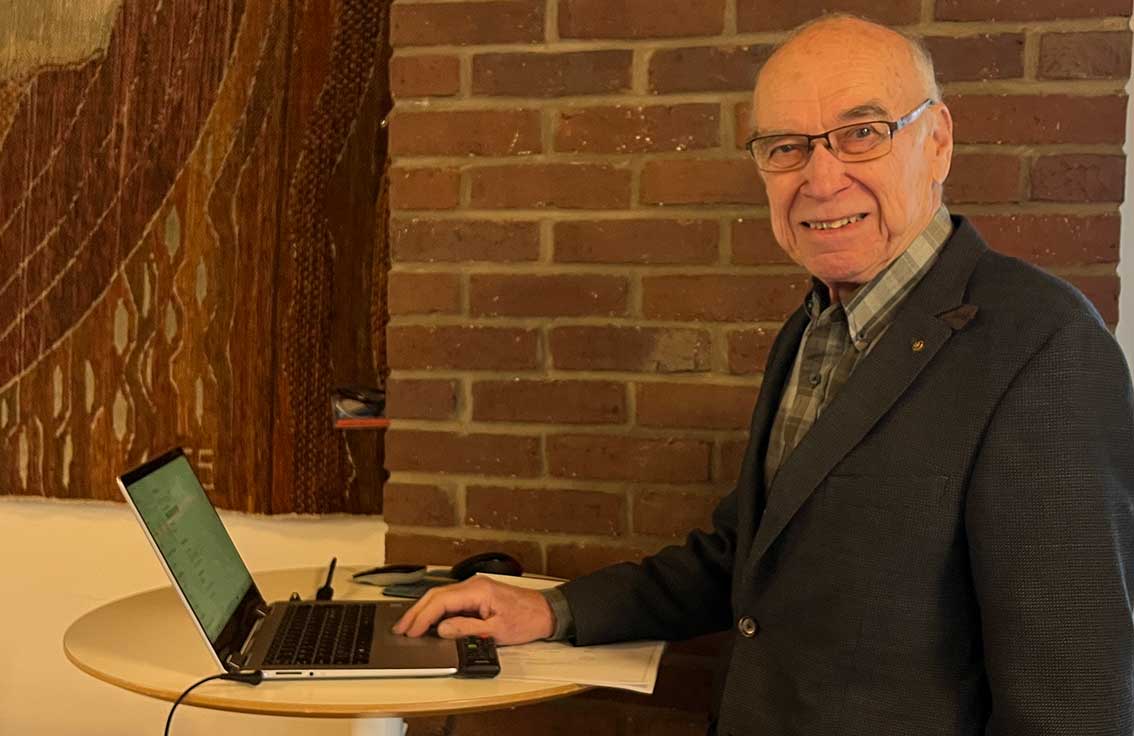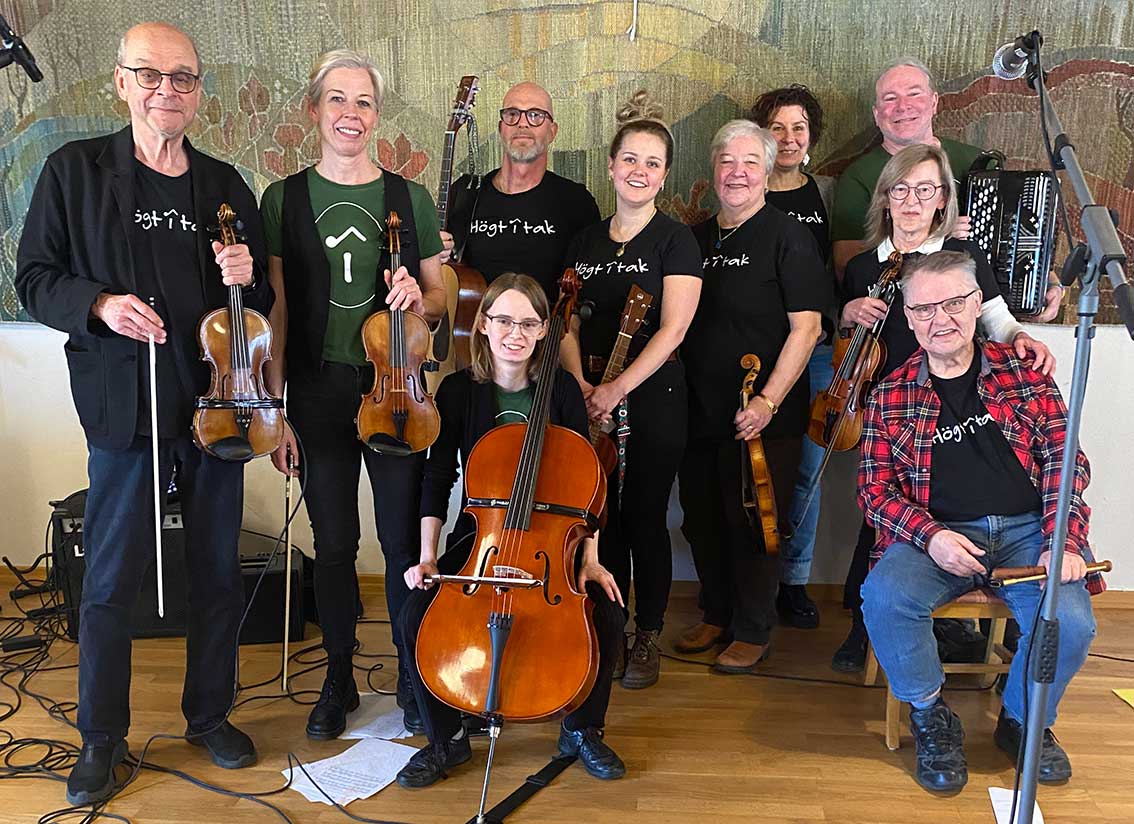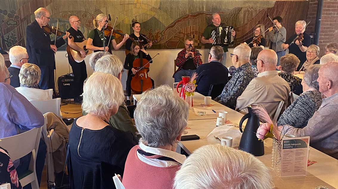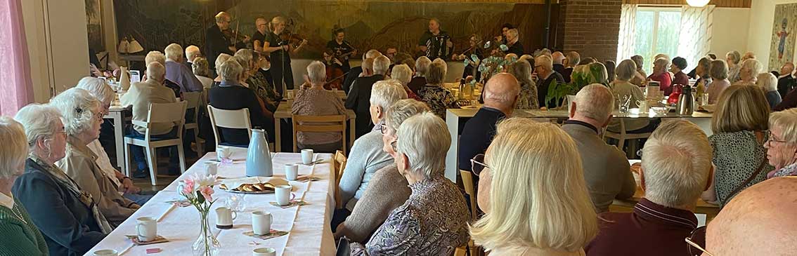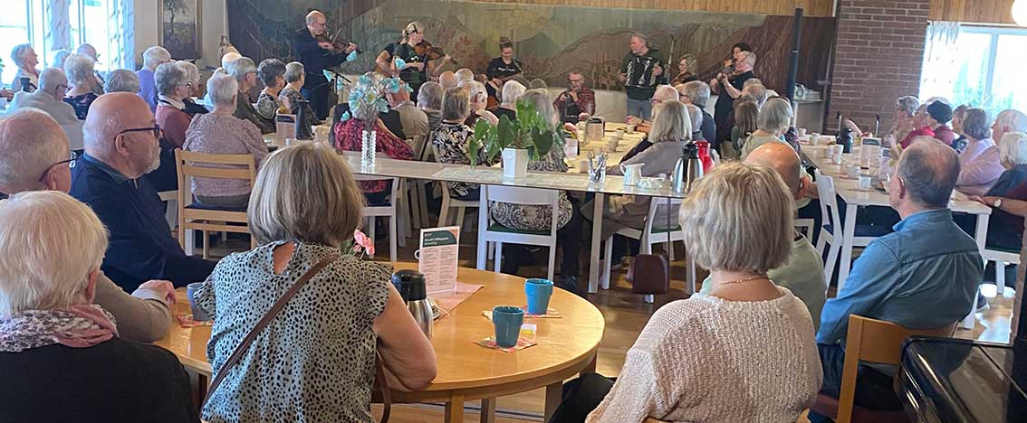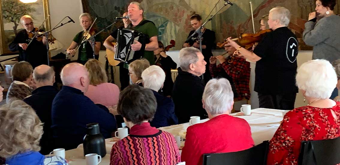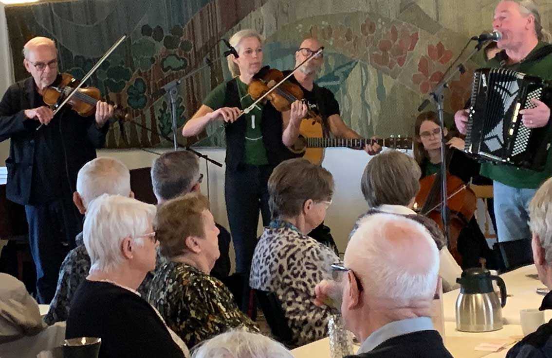 Det bjöds fartfylld musik och sång av Jönköpingsgruppen Högt i tak och det var verkligen ”drag under galoscherna”. Musikanterna inledde med Gärdebylåten och därefter följde flera stycken med irländsk touch: Dragspel, fiol, cello, tvärflöjt, blockflöjt trakterades skickligt till åhörarnas förtjusning.