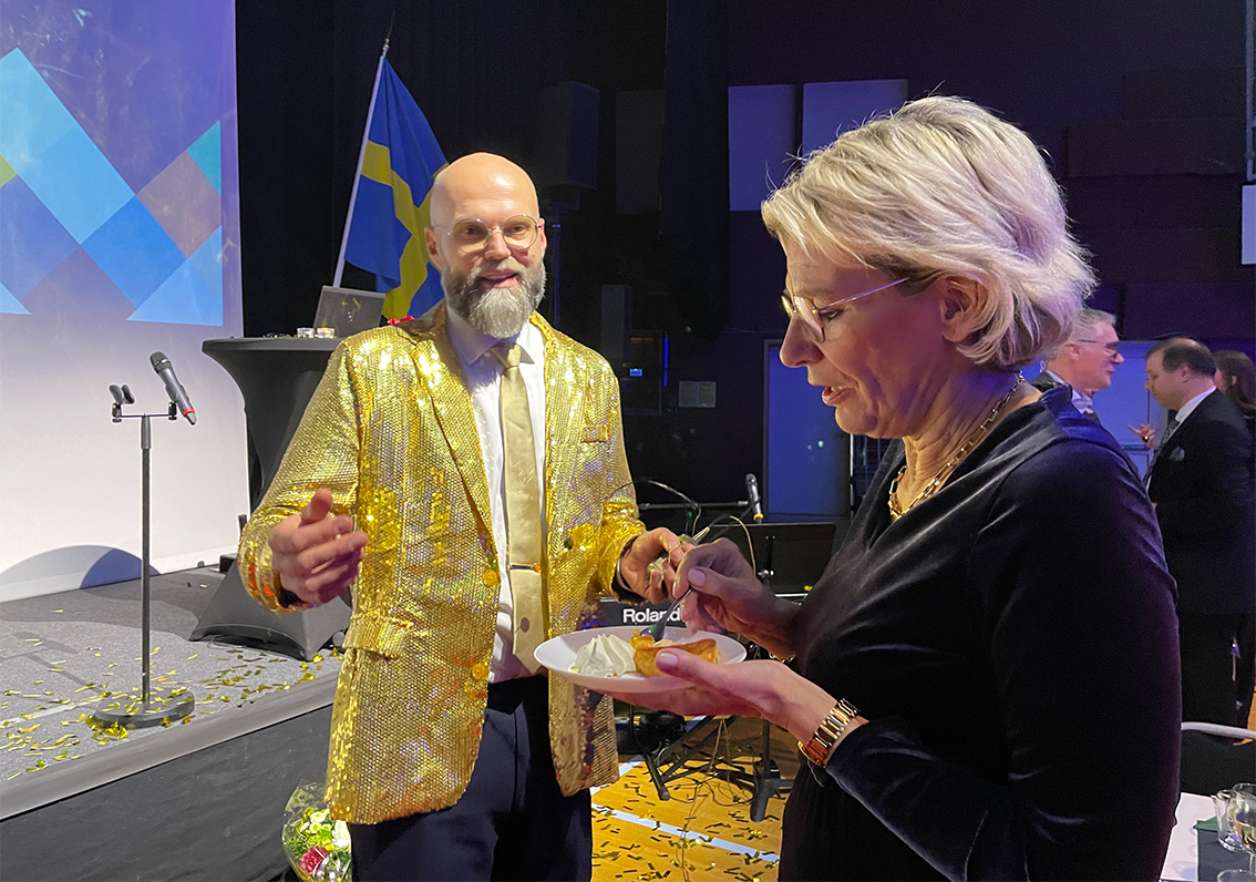 Tallnäs vd Emil Qvarnström och Gunilla Svensson från stiftsgården tog emot utmärkelsen från scenen. Johan Lundell, kommunens kommunikatör: varför tar stiftsgården emot utmärkelsen?