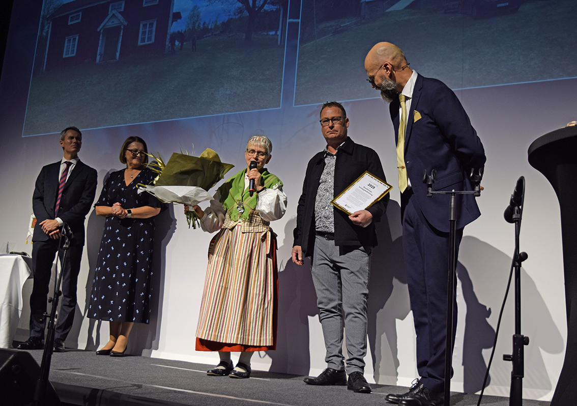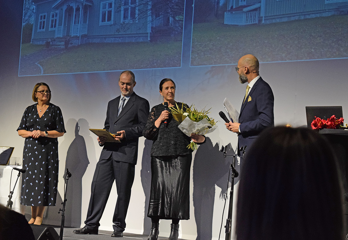 Ingrid och Patrik berättade från scenen: – Vi har behållit timmerstommen, innerdörrar, foder…. annars har vi nog för övrigt renoverat. Det behövdes ”piffas till lite”. Det har varit en del överraskningar genom resans gång, vi hittade kärleksbrev från 1914, vilket var en positiv överraskningen men tyvärr var brevet inte läsbart, berättar paret Forsberg när utmärkelsen delades ut.
