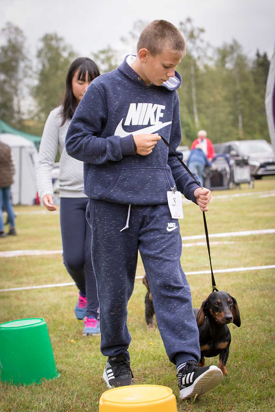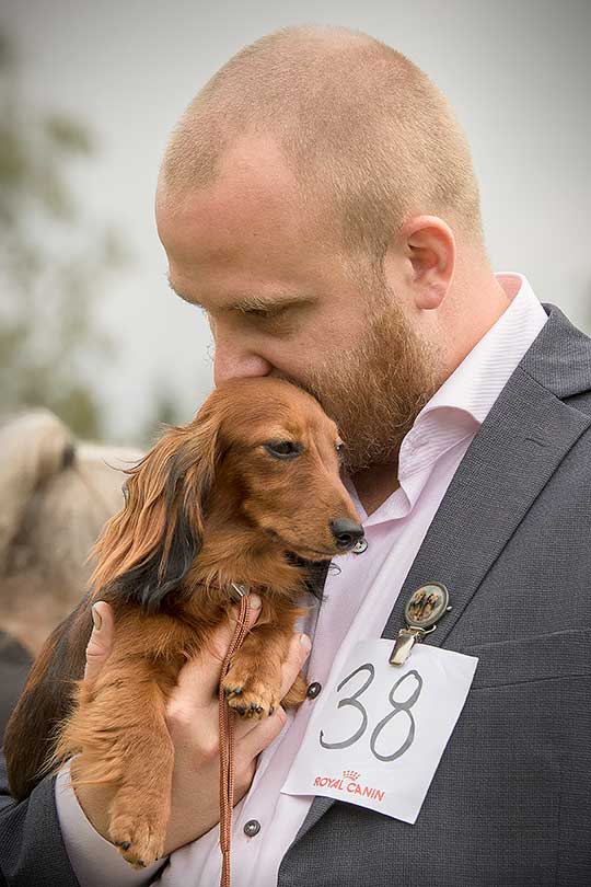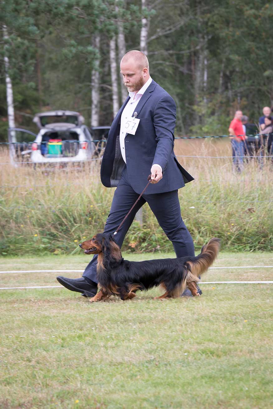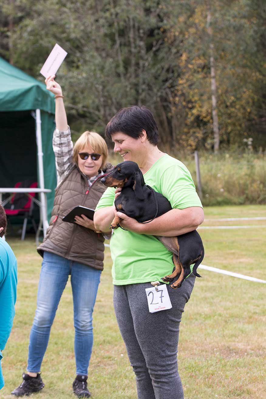 – Eftersom vi hade många hundar anmälda hade vi två domare. En domare bedömde valparna och långhåriga/korthåriga taxarna och en domare bedömde de strävhåriga. Man ser utifrån rasstandarden. Taxen är ursprungligen från Tyskland så det är Tyskland som bestämmer hur taxen ska se ut. Utställningen är en avelsvärdering kan man säga. Om den ser ut enligt standarden får den betyget ”Excellent”, betyget strax under är ”Very good”. ”Good” är betyget när det är sådär bra. Vi hade en tax som morrade åt domaren och det får man inte göra när man ställs ut, så den taxen blev diskvalificerad. Taxar ska vara glada och pigga, avslutar Mikael.