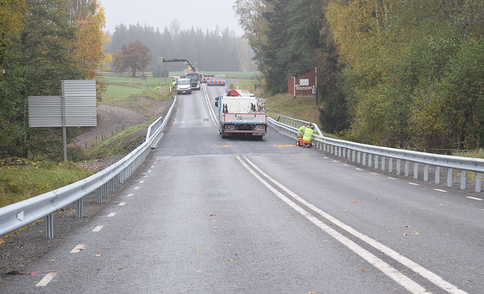 – Trafikverket har bytt kantbalkar och tätskiktsbyte. Vi har varit tvungna att stänga av riksvägen i samband med broararbetet då arbetsmiljön kräver det. Hade vägen och bron varit en halvmeter bredare hade vi inte behövt det men som det ser ut här så var avstängning det enda möjliga. Det ska vara 3,50 i bredd av arbetsmiljöskäl, berättar Jörgen Gustavsson som snart får ta bort avspärrningarna norr om Svenarum.