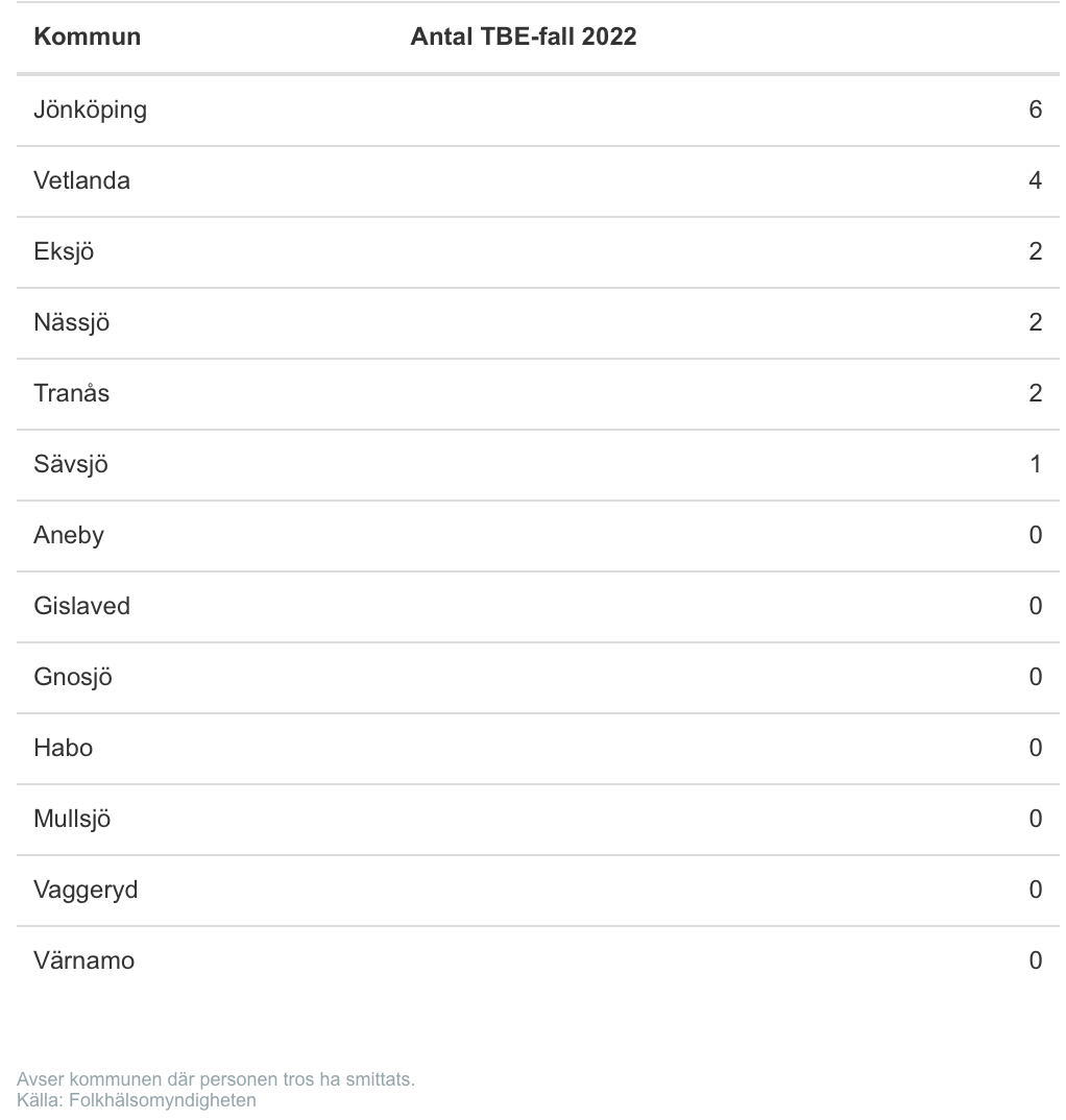 Under förra året rapporterades TBE-fall i sex av 13 kommuner i Jönköpings län. Flest fall noterades i Jönköpings kommun. Glädjande nog inrapporterades inga fall av TBE-smitta i Vaggeryds kommun under 2022 (se statistiken längre ned).