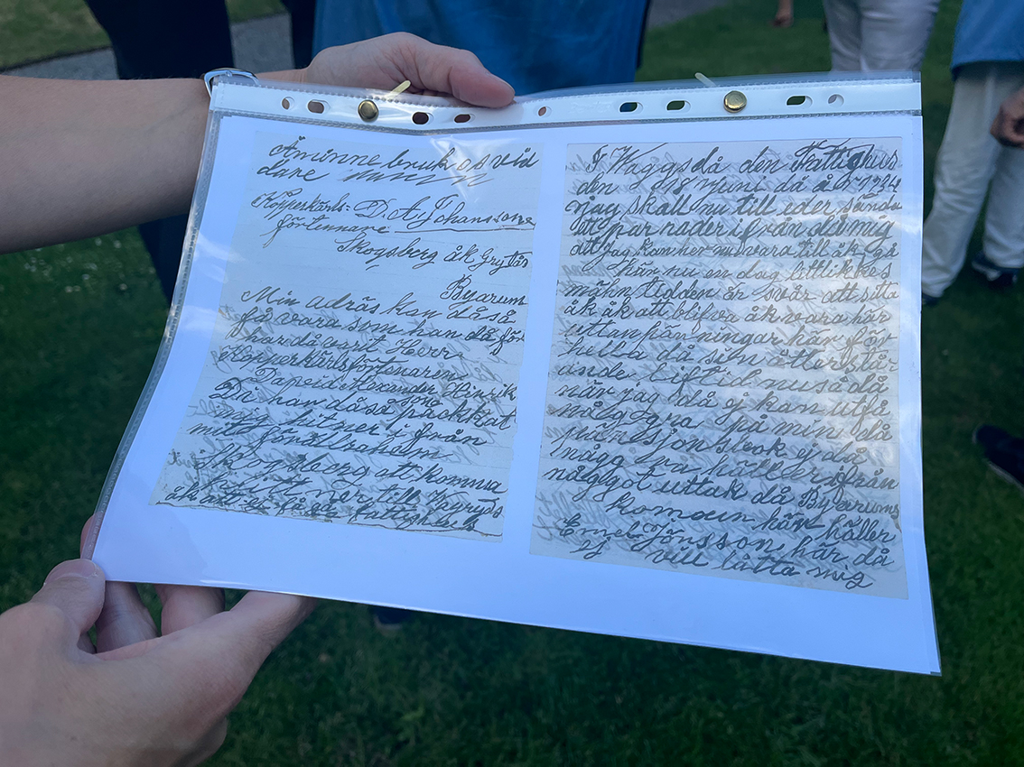 Först ut var Håkan som berättade vid en liten gravsten som det står Alexander Johansson på. Familjen tillhörde vandringsfolket och flackade runt mycket. Alexander levde mellan 1858 och 1944 och han blev kopparförtennare bland annat. Han hade kanske så många som 18 syskon och de bodde i en liten backstuga ute i skogen. Stugan revs och blev till ved på Vaggeryds mejeri 1943. Hans familj levde under märkliga förhållanden och där var mycket slagsmål och bråk. 1897 var delar av familjen i ett riktigt bråk som utspelade sig i Bondstorps socken.