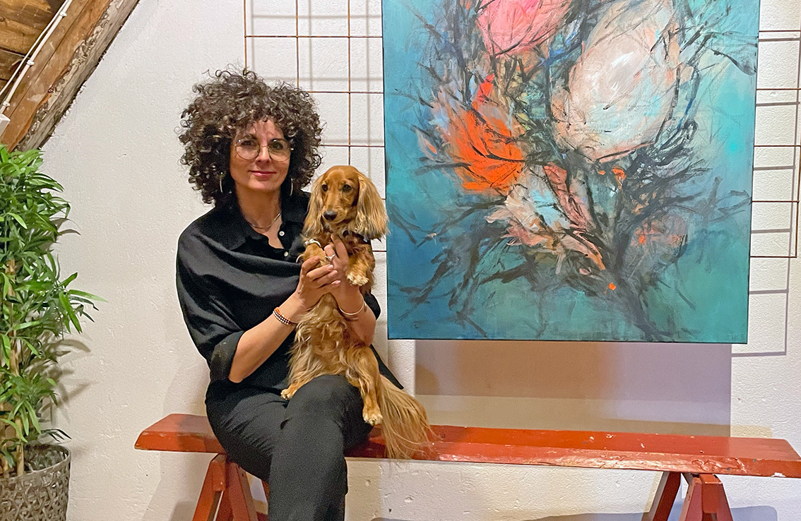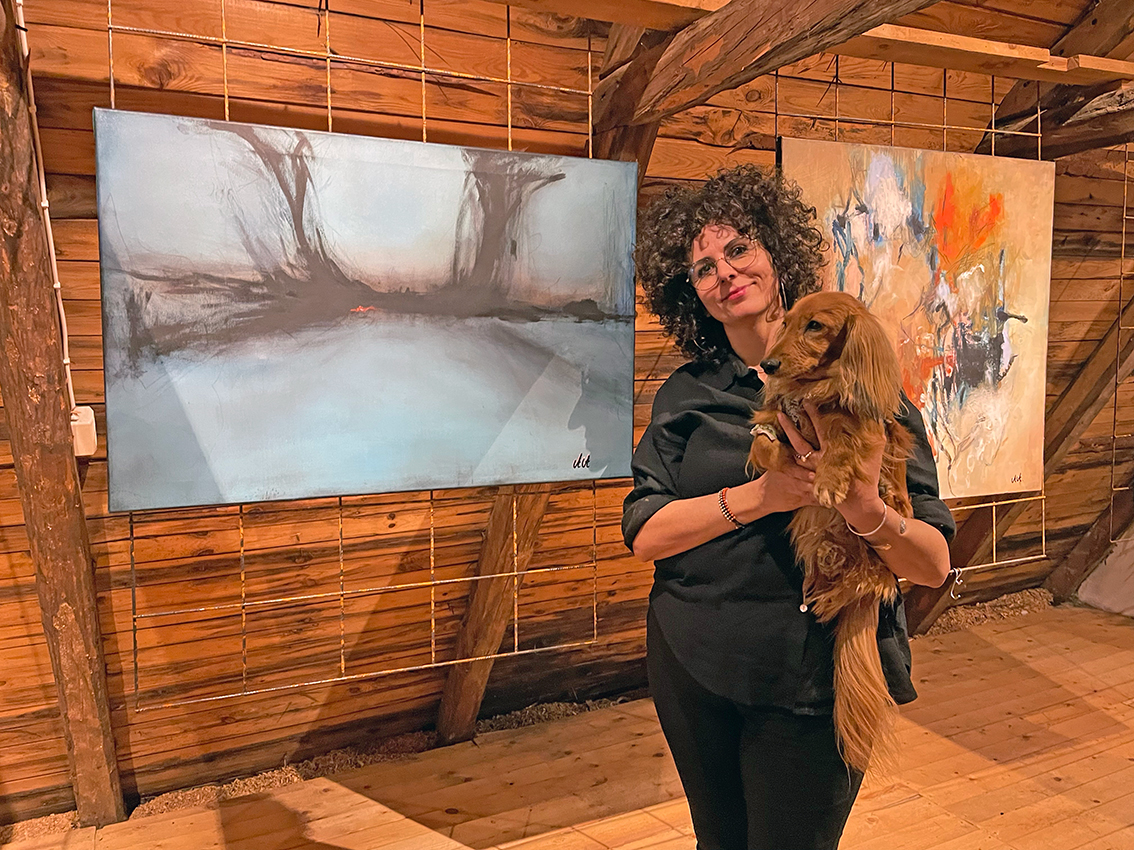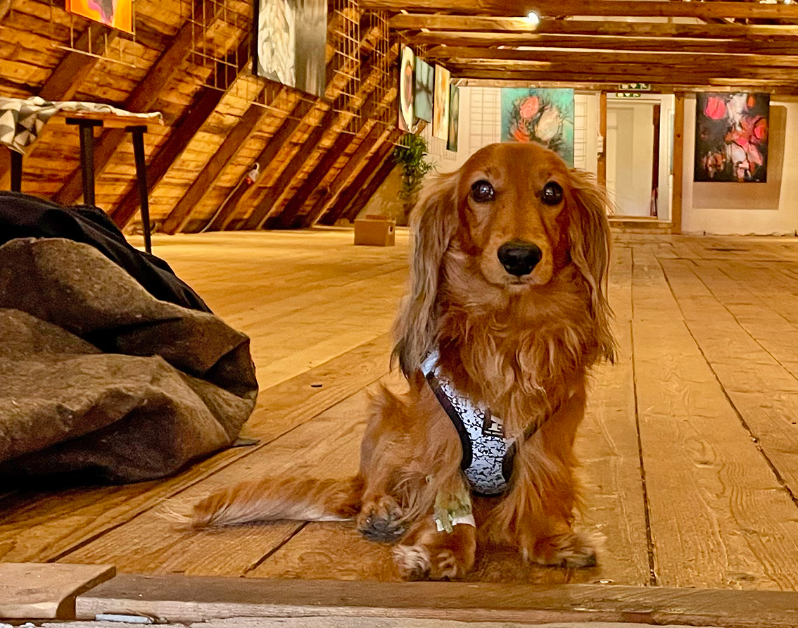 Med sig på Vinden har Anna med sig hunden Glenn-Gunnar, en trevlig liten långhårig tax. – Han har varit otroligt många timmar med mig i ateljén och han är alltid med när jag målar i princip. Han är världens snällaste, lugnaste men också en viltspår-champion, avslutar Anna.