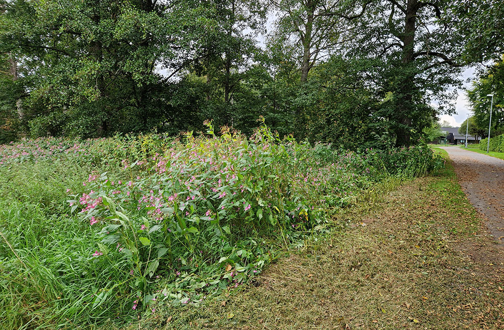 Intill gång- och cykelvägen till skolan finns den invasiva arten jättebalsamin
