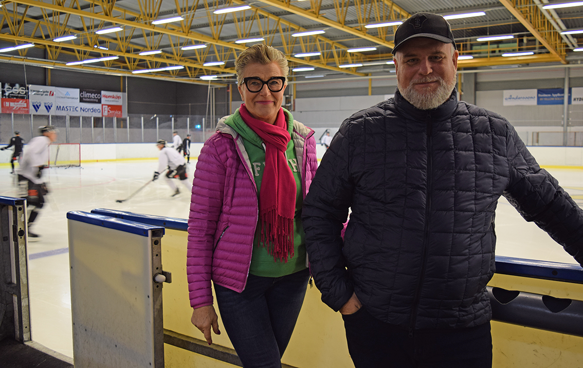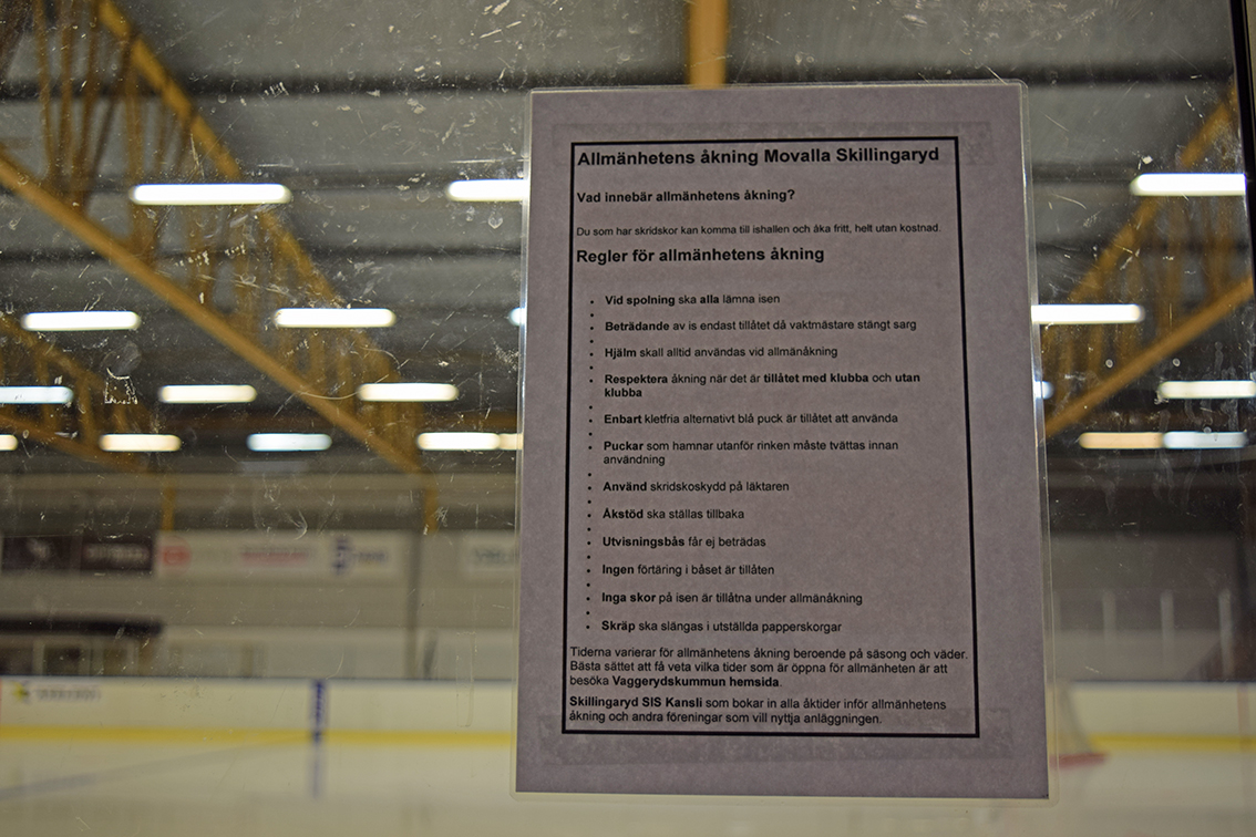 Carina Remnemark, ordförande i föreningen Skillingaryds Idrottssällskap (huvudstyrelsen), och Peter Bergström som är ordförande i Movalla IP möter oss i ishallen. Kommunen äger anläggningen och föreningen utövar träningar för olika hockeylag och den övriga tiden har kommunen allmän åkning. Historiskt sett har den allmänna åkningen utövats på helger och när det inte varit matcher.