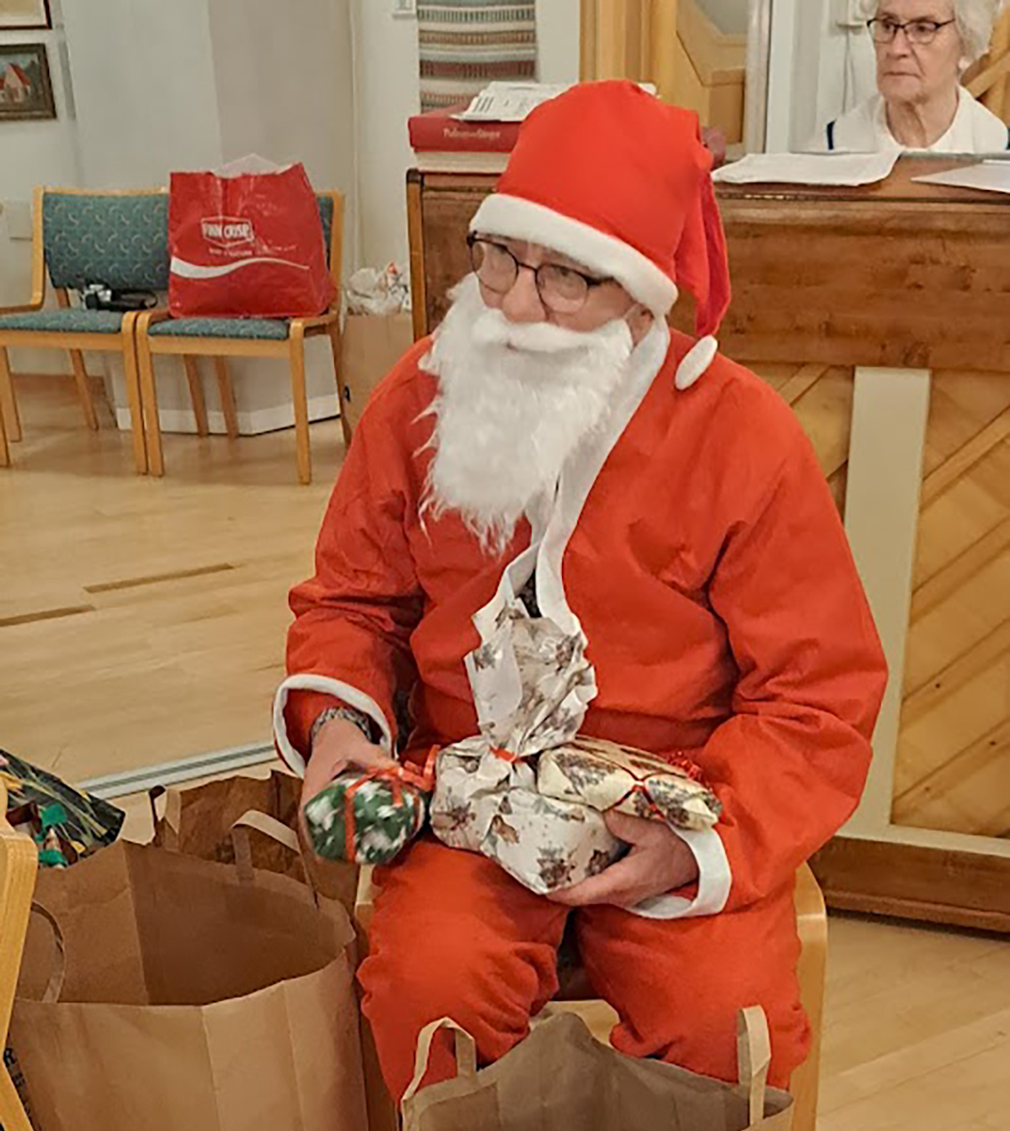 Plötsligt dök tomten upp ”från ingenstans” med en massa julklappar som delades ut till alla medlemmar, i år bjöds alla på varsin julklapp av FUB.