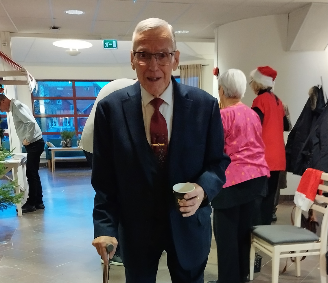 Anders Mattsson uppmärksammade Ingeborg Edqvist för hennes trettiofemåriga engagemang med musiksammankomster på Furugården i Vaggeryd. Hela 33 gånger har Ingeborg genomfört dessa under 2025 och Anders uppvaktade med en blomsteruppsats.