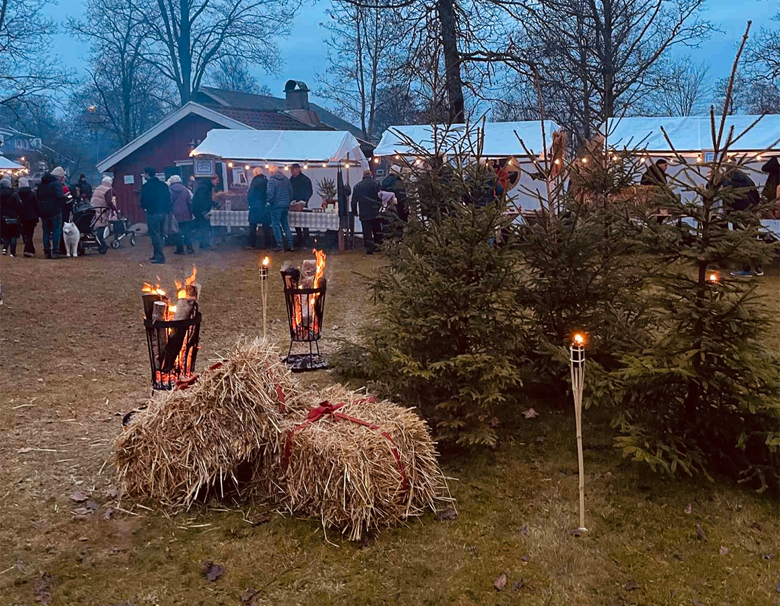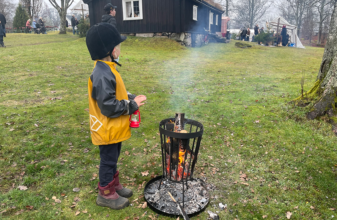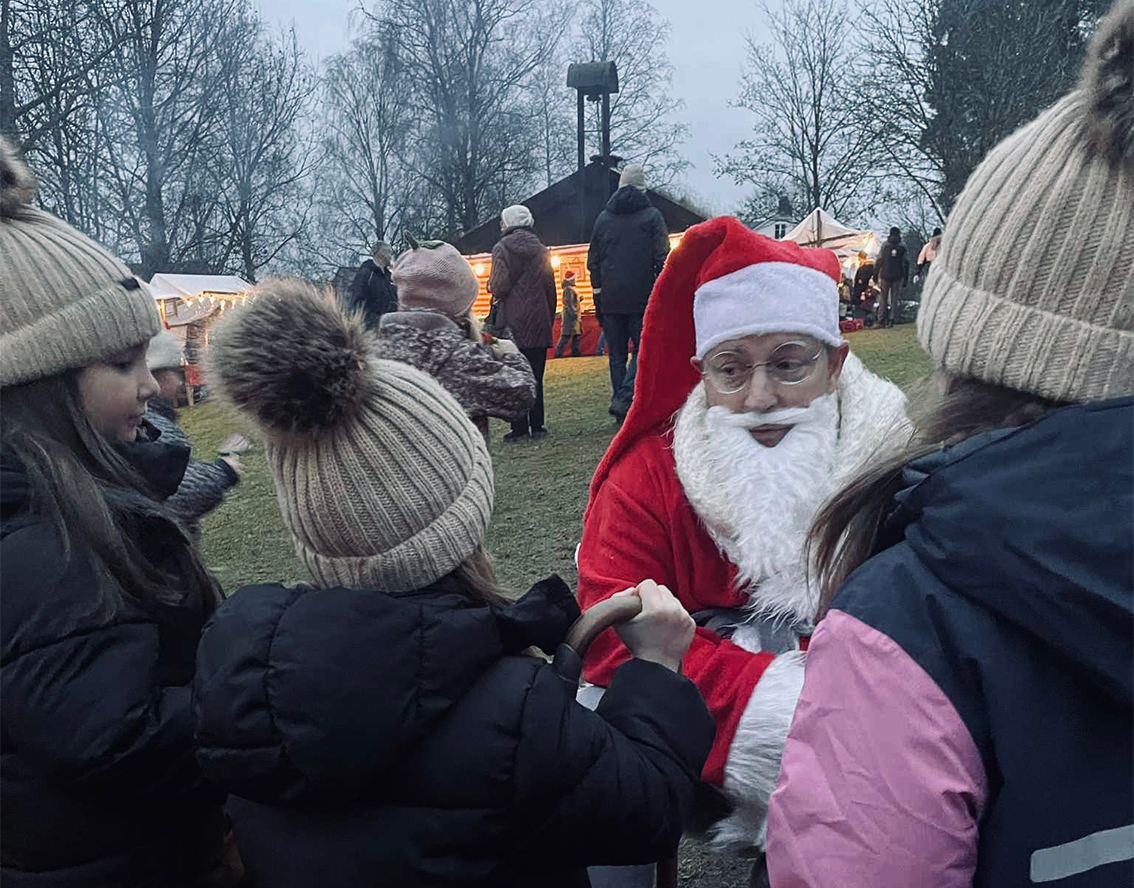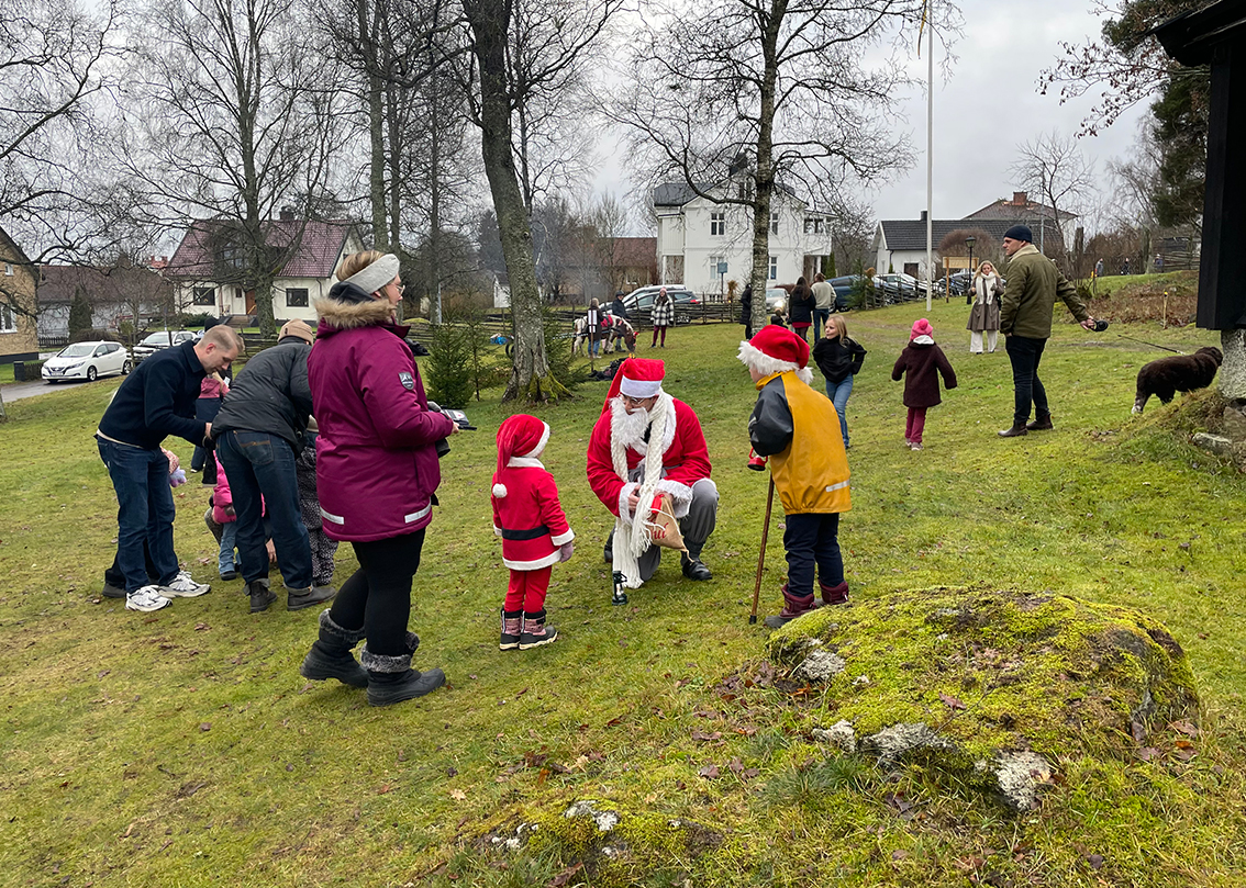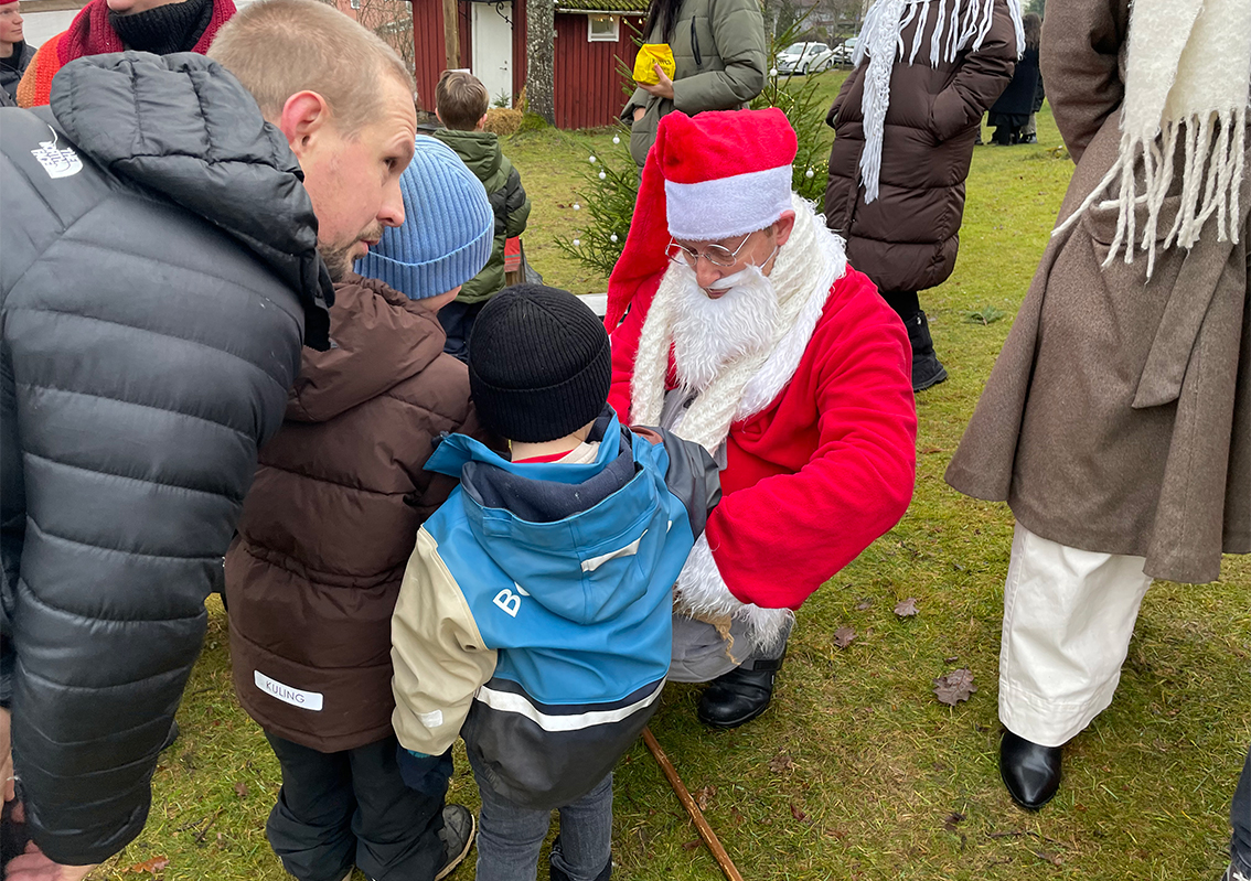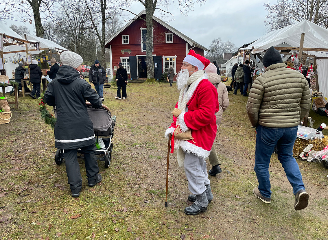 Plötsligt är det tomtedags- tomten kom på besök till hembygdsparken. Med sig hade han chokladtomtar som han delade med sig av till barnen. Med käpp och lykta i handen tog han sig runt den långa vändan som det var att gå igenom hela marknaden. Det var försäljare och stånd överallt, förbi smedjan och ända bort till vagnhuset. Runt hela parken brann eldar i hemmasnidade eldkorgar.