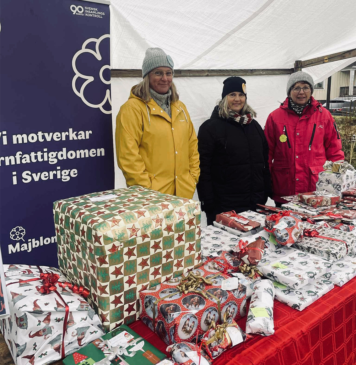 Majblomman i Vaggeryd och Skillingaryd var med. Deras bord svämmade över av julklappar som människor har skänkt, och som barn har slagit in – till barn som kanske inte får någon julklapp annars.