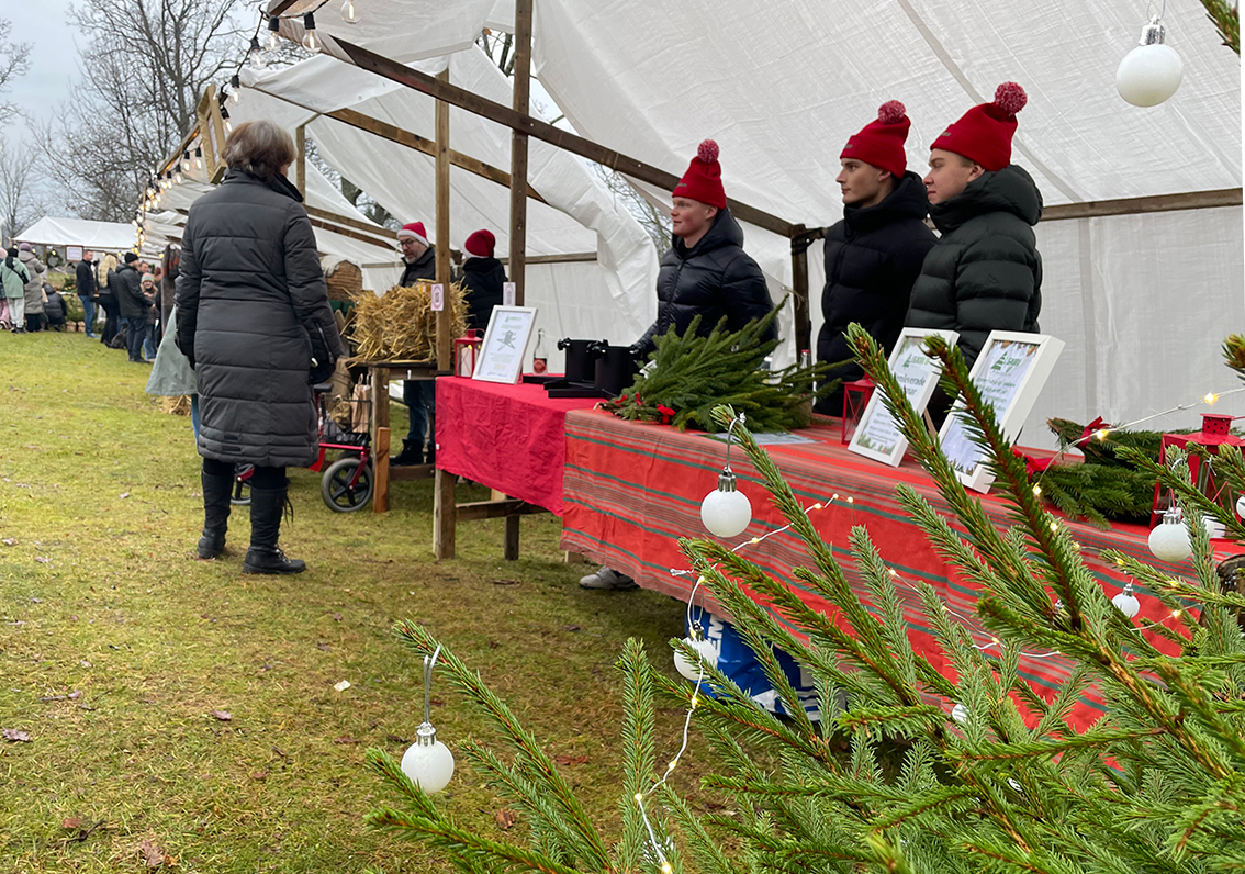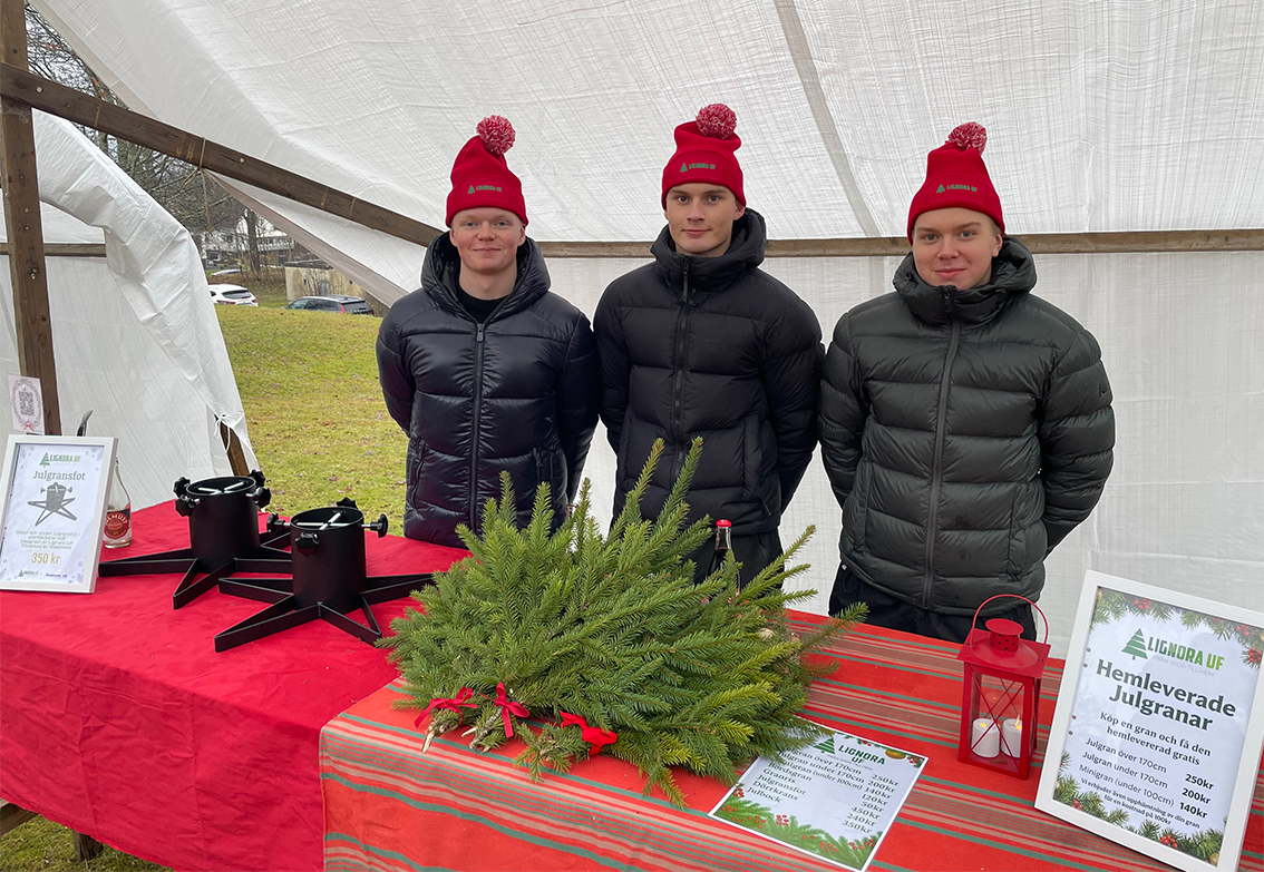 Axel Persson, Odin Larsson och William Svensson från Lignora UF säljer julgranar, granris och kransar.