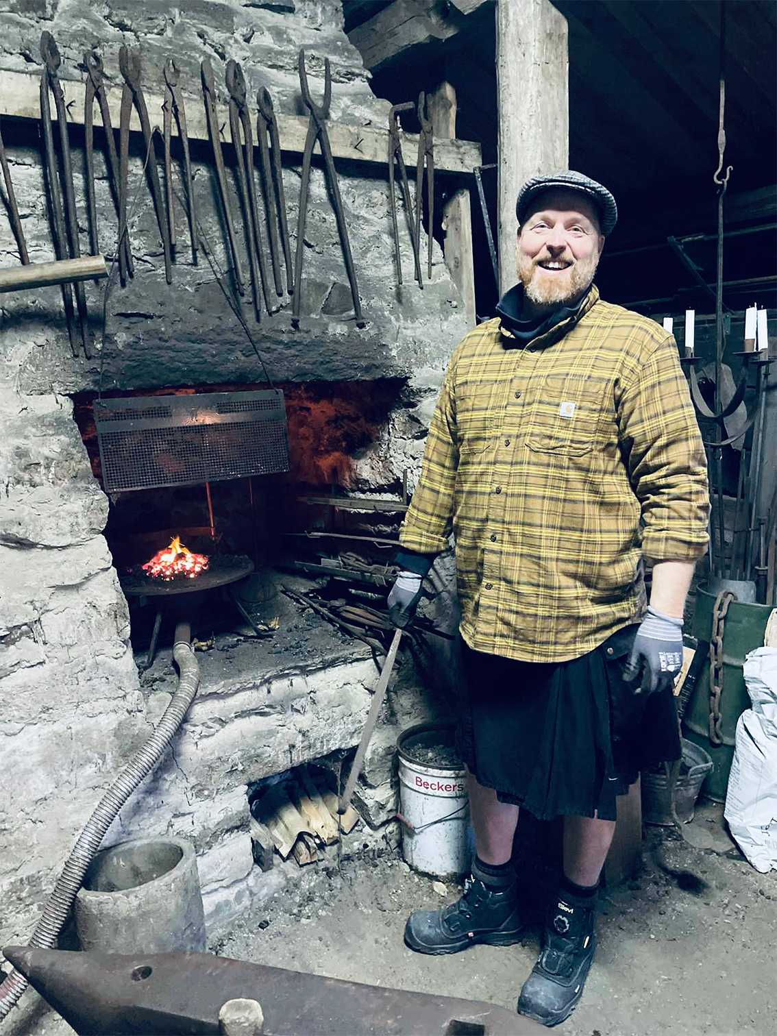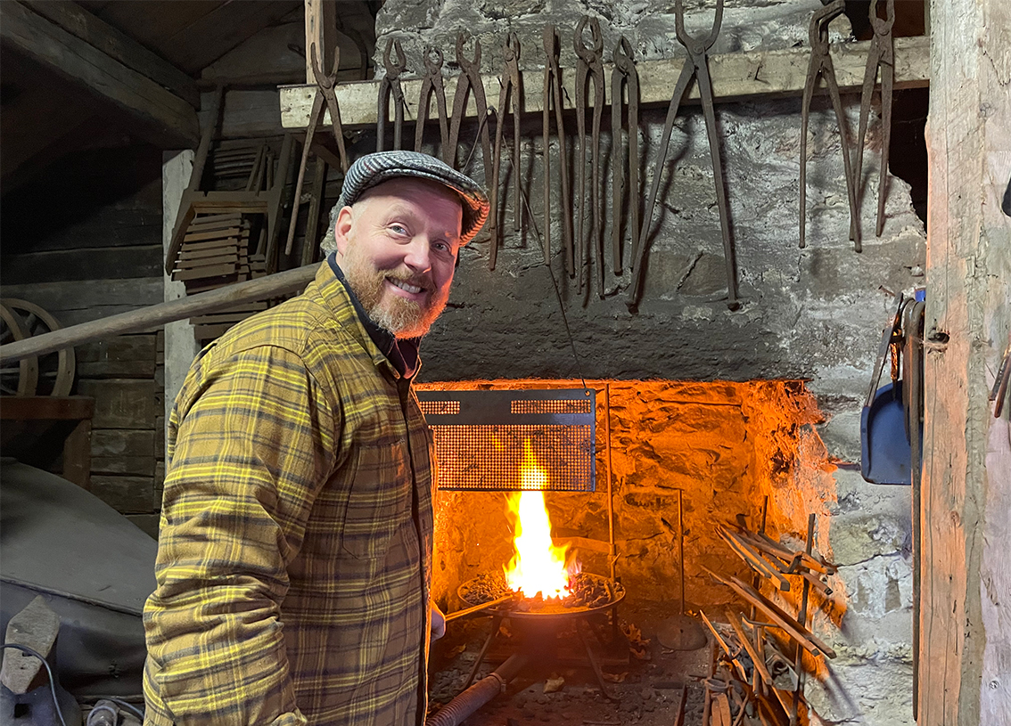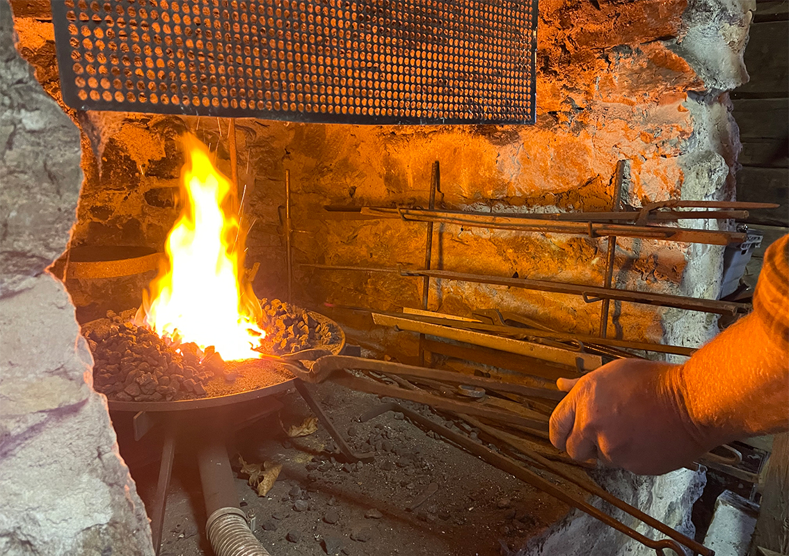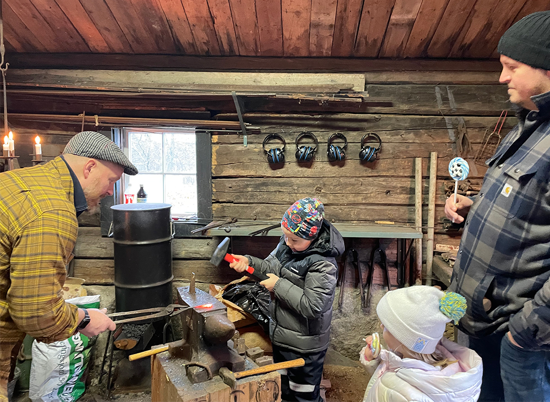I smedjan fick man pröva på att göra krokar i järn. Mikael Ljungqvist skötte elden och såg till att göra järnet glödhett. Max fick pröva att hamra och böja på det glödande järnet.
