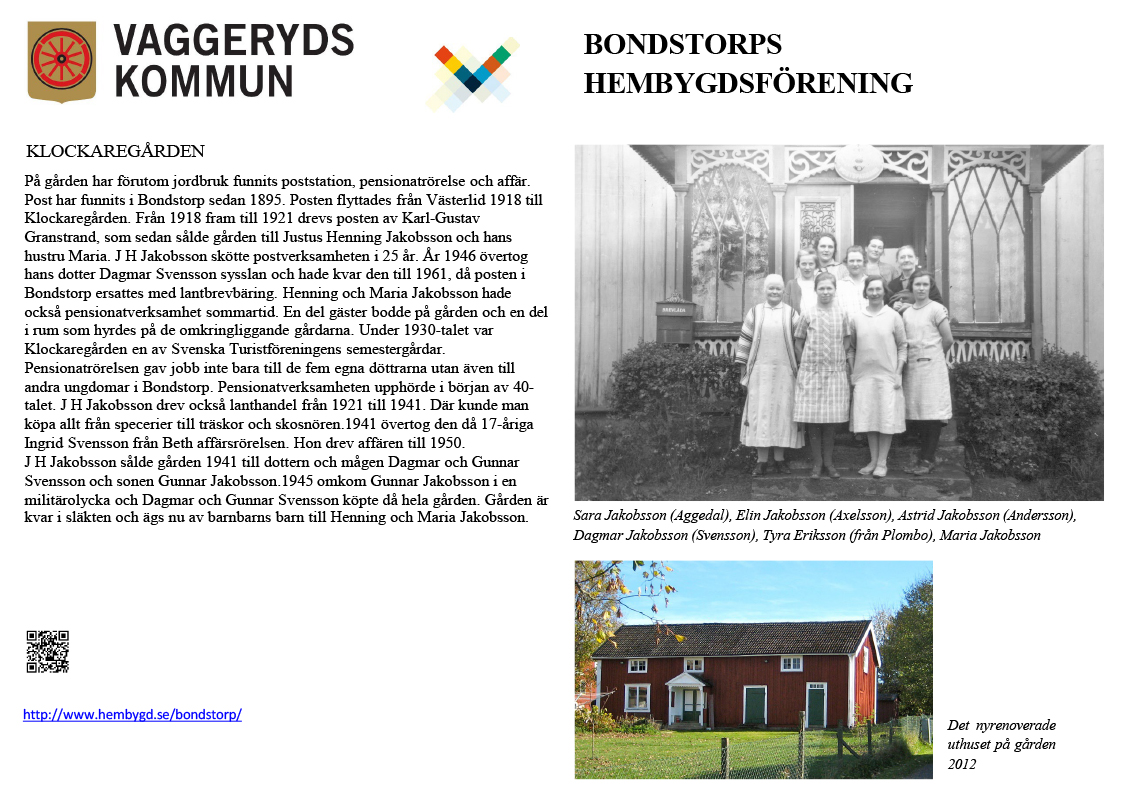 På gården har förutom jordbruk funnits poststation, pensionatrörelse och affär. Post har funnits i Bondstorp sedan 1895. Posten flyttades från Västerlid 1918 till Klockaregården. Från 1918 fram till 1921 drevs posten av Karl-Gustav Granstrand, som sedan sålde gården till Justus Henning Jakobsson och hans hustru Maria. J H Jakobsson skötte postverksamheten i 25 år. År 1946 övertog hans dotter Dagmar Svensson sysslan och hade kvar den till 1961, då posten i Bondstorp ersattes med lantbrevbäring. Henning och Maria Jakobsson hade också pensionatverksamhet sommartid. En del gäster bodde på gården och en del i rum som hyrdes på de omkringliggande gårdarna. Under 1930-talet var Klockaregården en av Svenska Turistföreningens semestergårdar.
