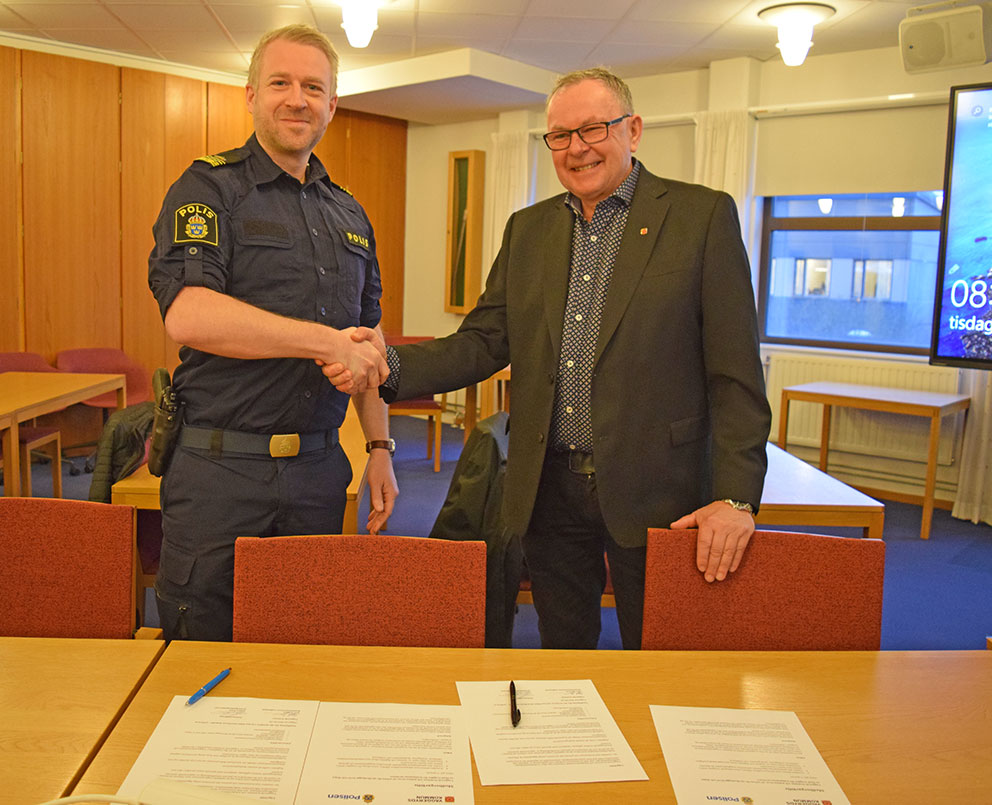 – Även detta löfte gör att vi kommer att förebygga och jobba tillsammans med er i kommunen där vi kommer göra rätt insatser med rätt resurser. Vi har en lägesbild som vi följer kontinuerligt. Vi samlar in information från verksamheter, vad har vi sett senaste månaden och vad ser vi framöver. Vårt fokus är brottsförebyggande och trygghet. Vilka platser ska vi besöka och vi har olika fokusområden som vi kommer att prioritera. I löftet finns narkotikabrottslighet, förebygga våldsbrott, mäns våld mot kvinnor, skadegörelser, bedrägerier och trafik nedskrivna. Det är dessa områden vi fokuserar på, berättar polisen innan Anders Sund och Gert Jonsson undertecknar medborgarlöftet.