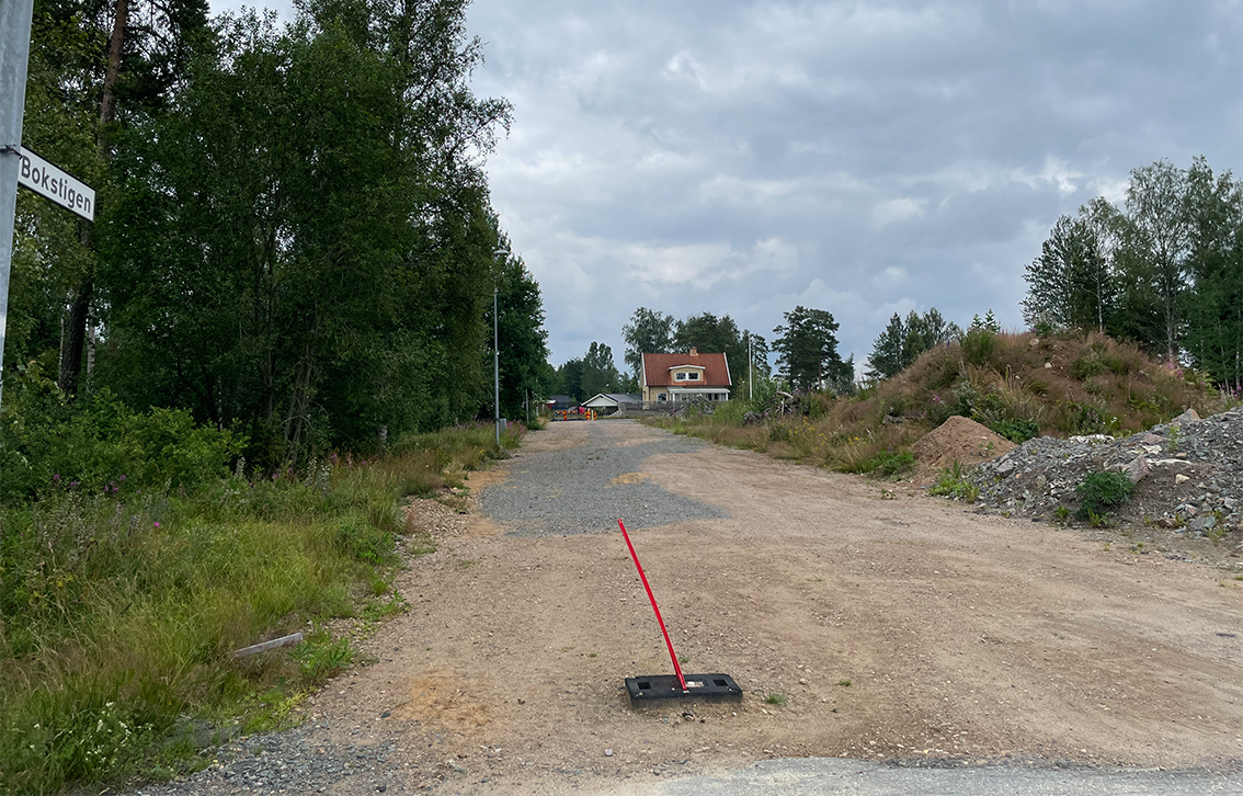 Ett stenkast söder ut från Stationsgatan har vi platsen som går i vinkel mellan Runstensvägen och Bokstigen. Bokstigen består av grus, sand och småsten och på platsen stora högar med grus, sten och sand. Det ser ut som ett projekt som avstannat, en plats där hjulen har slutat snurra för länge sen. Flera av högarna är helt överväxta.