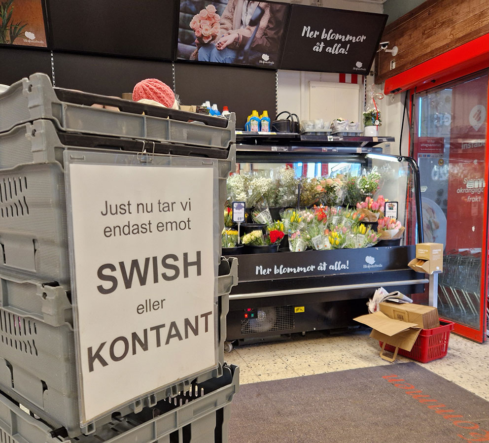 Detta är de digitala betalningslösningarnas förbannelse! Det är smidigt om / när det fungerar, och det är nödvändigt att butikerna som här har fullt öppet för kontantbetalning. Men det finns många butiker som vägrar kontantbetalning, och där måste lagstiftningen ingripa. Kontanter måste fungera i alla situationer, och allt annat måste förbjudas. Men både staten och bankerna stretar emot. Det är en dröm för dem att kunna ha 100% kontroll över vad folk handlar och att sedan kunna avgiftsbelägga efter eget önskemål.