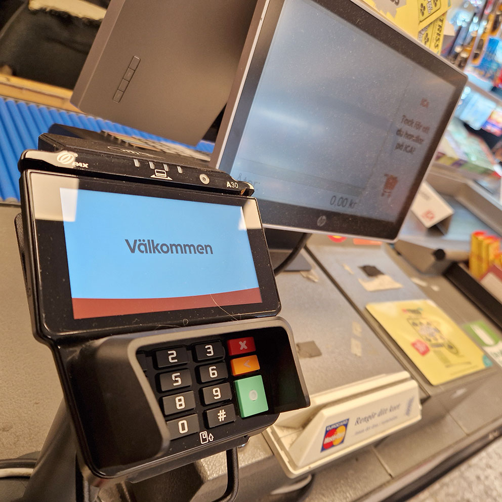 När vi är vid kassan i Skillingarydsbutiken har tjejerna någon i telefonen och följer instruktioner, kassorna startas om. "Det verkar fungera", säger en av tjejerna. Vi på tidningen blev andre testperson att betala med kort och det gick bra.