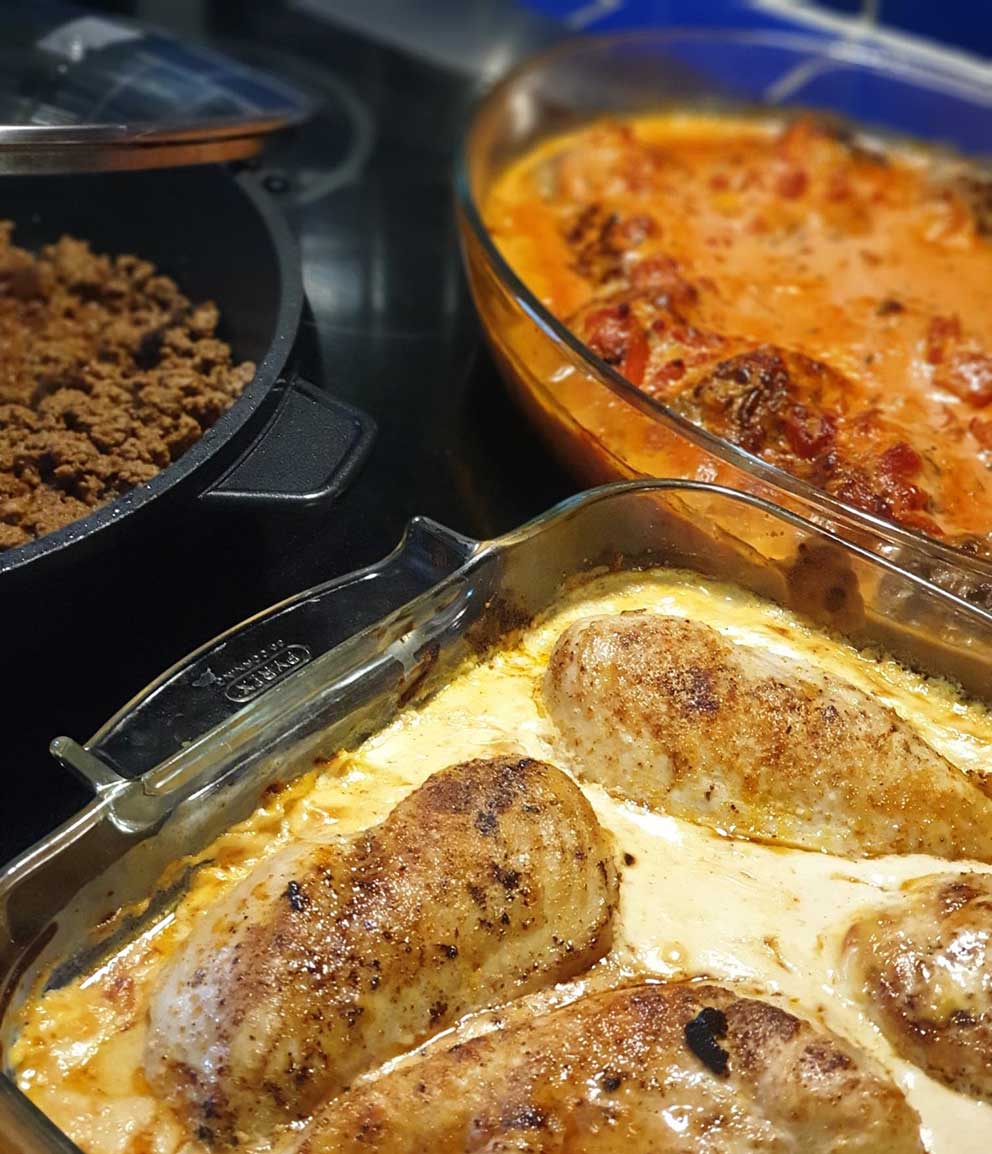 Under tiden steker jag valfria grönsaker, smaksätter enligt ”dagsform”. När kycklingen är klar (behöver inte vara helt klar eftersom den blir det i grytan) tar jag upp den, delar och lägger i tillsammans med grönsaker. Sedan är det bara att hälla i valfritt av grädde/kokosmjölk/ crème fraîche, smaka av, reda om man vill (tar Maizena eller liknande istället för mjöl) och så är det klart att serveras med valfritt tillbehör.