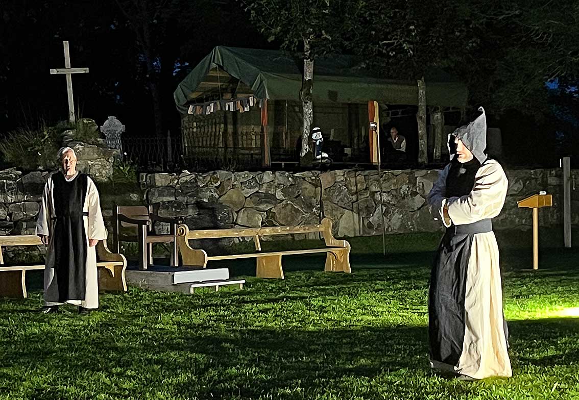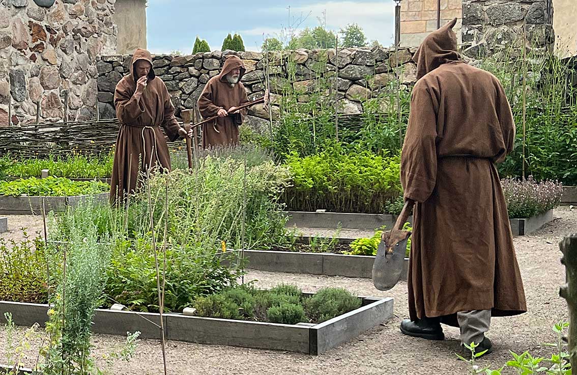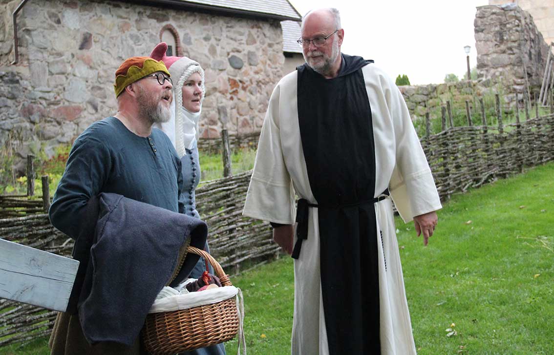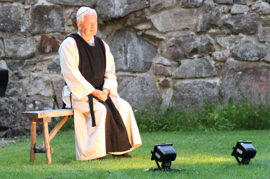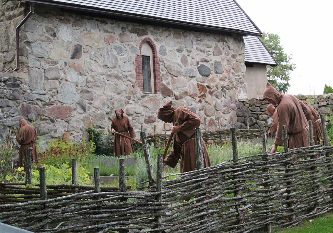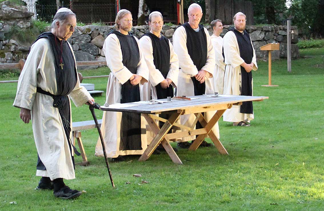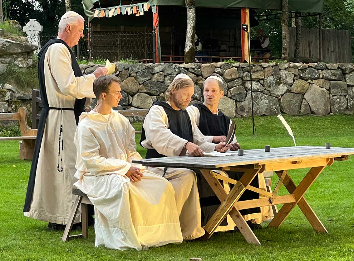 Spelet visar scener ur klosterlivet, till exempel arbete i skrivarstugan och uppbörd av avrad. En scen framställer den dagliga samlingen i kapitelsalen, klostrets näst kyrkan viktigaste rum. Där hölls kapitel med läsning ur bland andra ordensreglerna och ordensgrundaren den helige Bernhards skrifter. Där höll också abbotens räfts med munkar som begått någon förseelse och där inleddes invigningen av noviser till nya munkar. Vigningen avslutades sedan med en ceremoni i kyrkan och med att novisen fick den så kallade tonsuren. Det innebar att hans hjässa rakades; hårkransen som blev kvar symboliserade Kristi törnekrona. Bröderna i klostret var dels de invigda präst- eller kormunkarna, dels konverser eller lekbröder. De bar olika dräkt och fyllde olika funktioner i sin uppfyllelse av cistercienserordens motto ”Bed och arbeta”.