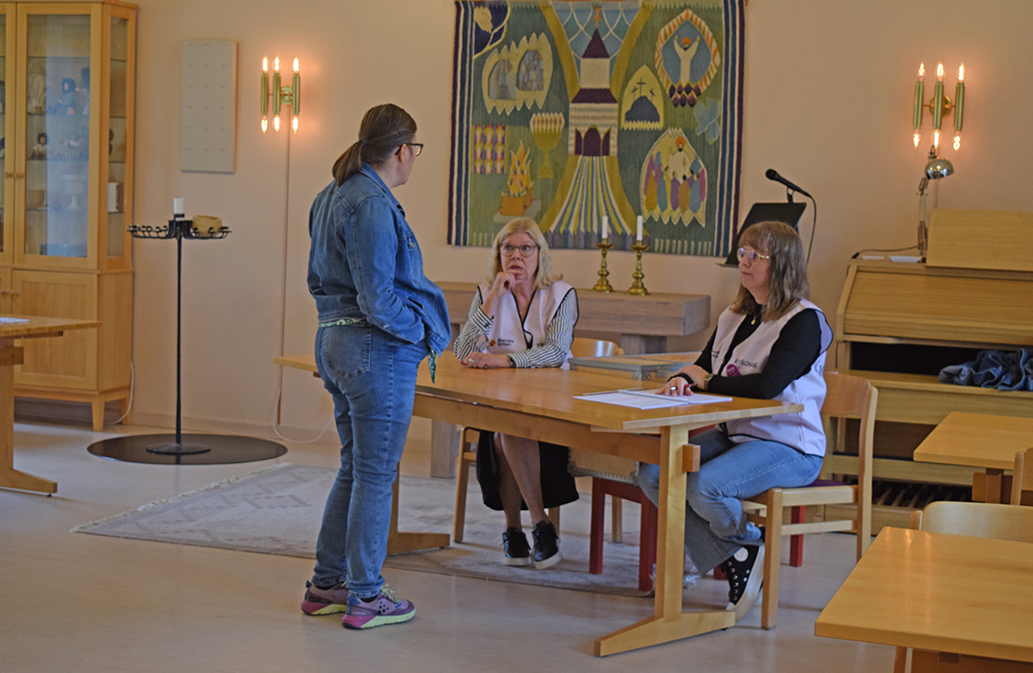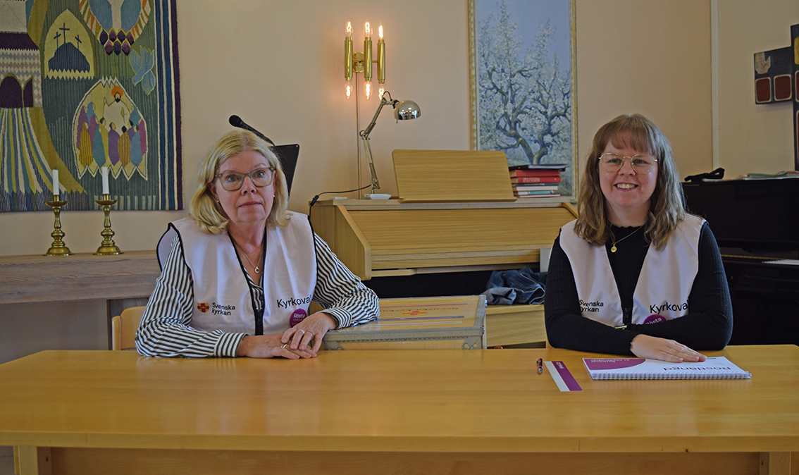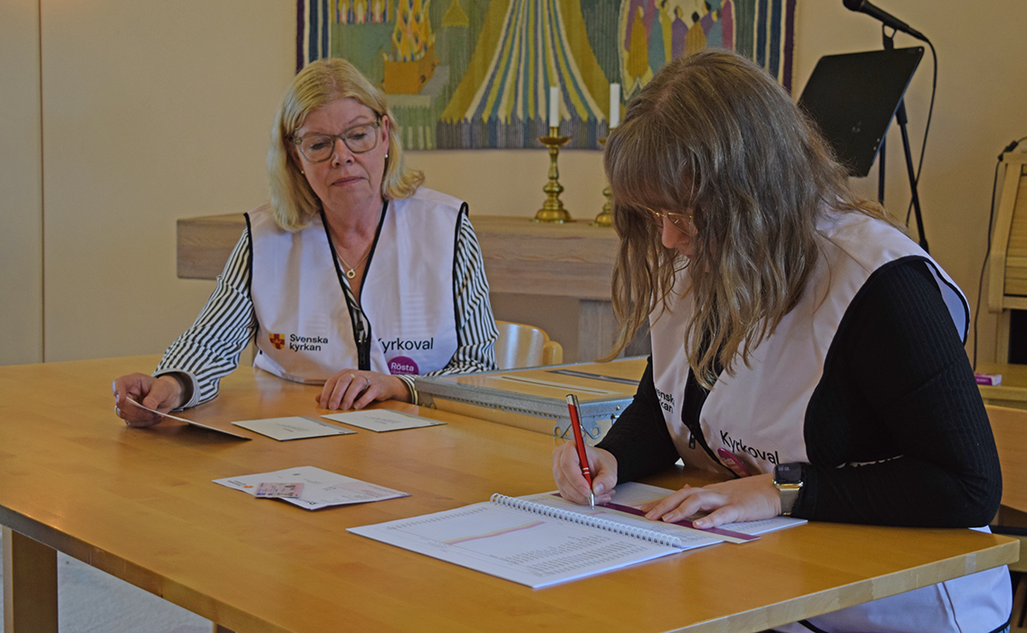 När det var gjort togs de tre kuverten med till Felicia Nilsson och Kjerstin Bengtsson. Här bockades medlemmen av i röstlängden, valkuverten kontrollerades och lades i respektive fack i vallådan.