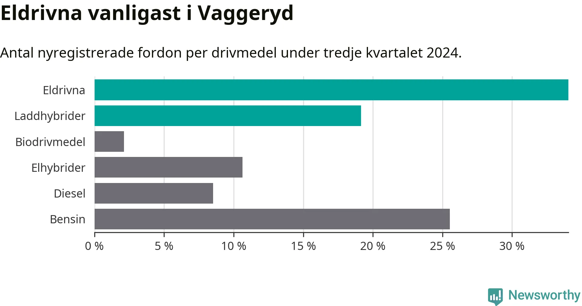 Under tredje kvartalet 2024 registrerades totalt 47 nya bilar i Vaggeryd, varav 53 procent var laddbara – huvudsakligen elbilar som utgjorde 34 procent. Fossildrivna bilar stod för 45 procent av registreringarna. Denna minskning av laddbara bilar följer en bredare trend där den snabba elektrifieringen av bilparken i Sverige har mattats av. I Vaggeryd nådde andelen laddbara fordon sin högsta nivå under första kvartalet 2023, med 73 procent.
