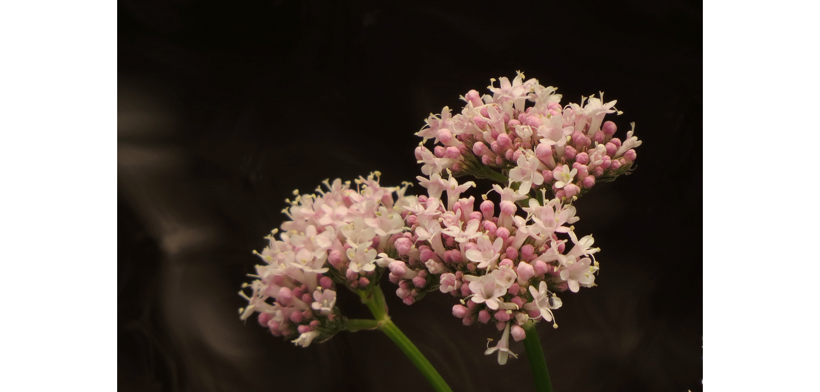 Bilden visar blommande flädervänderot, ”Valeriana sambucifolia”, som är en ganska högväxt, flerårig ört med djupt parflikiga blad och vita eller rosa blommor.