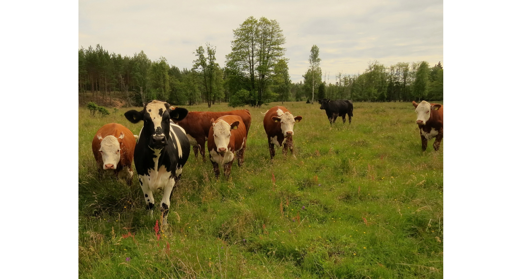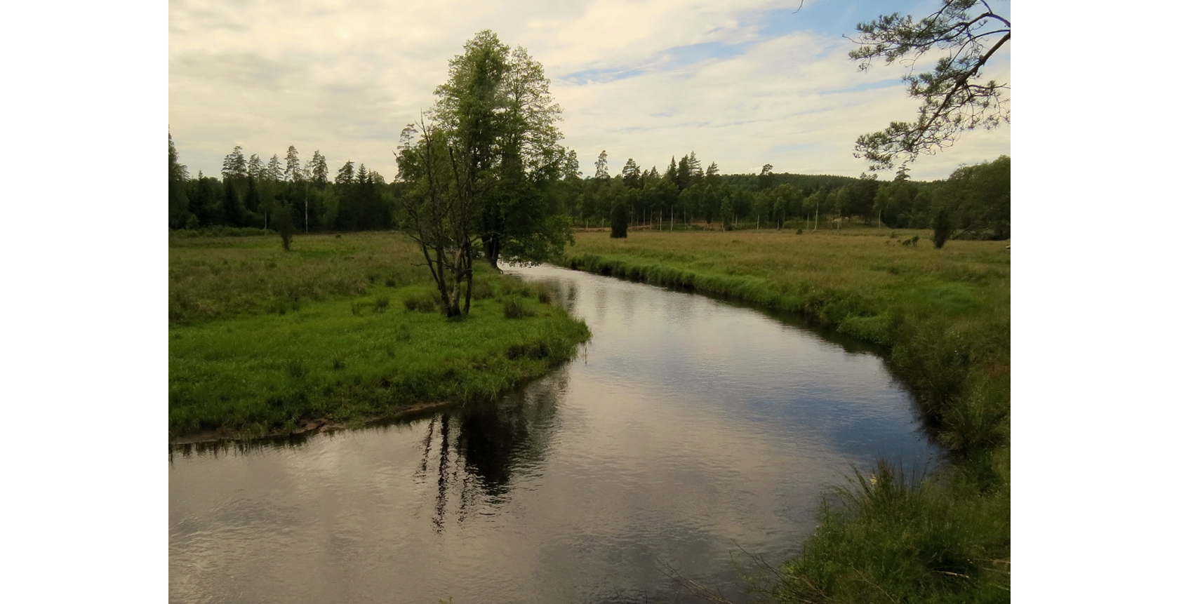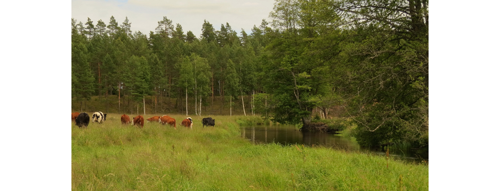 Det är något rofyllt vackert med detta landskap, det rinnande vattnet, de vackra strandängarna med tallmoarna i bakgrunden, bården med klibbal samt med de betande nötkreaturen.