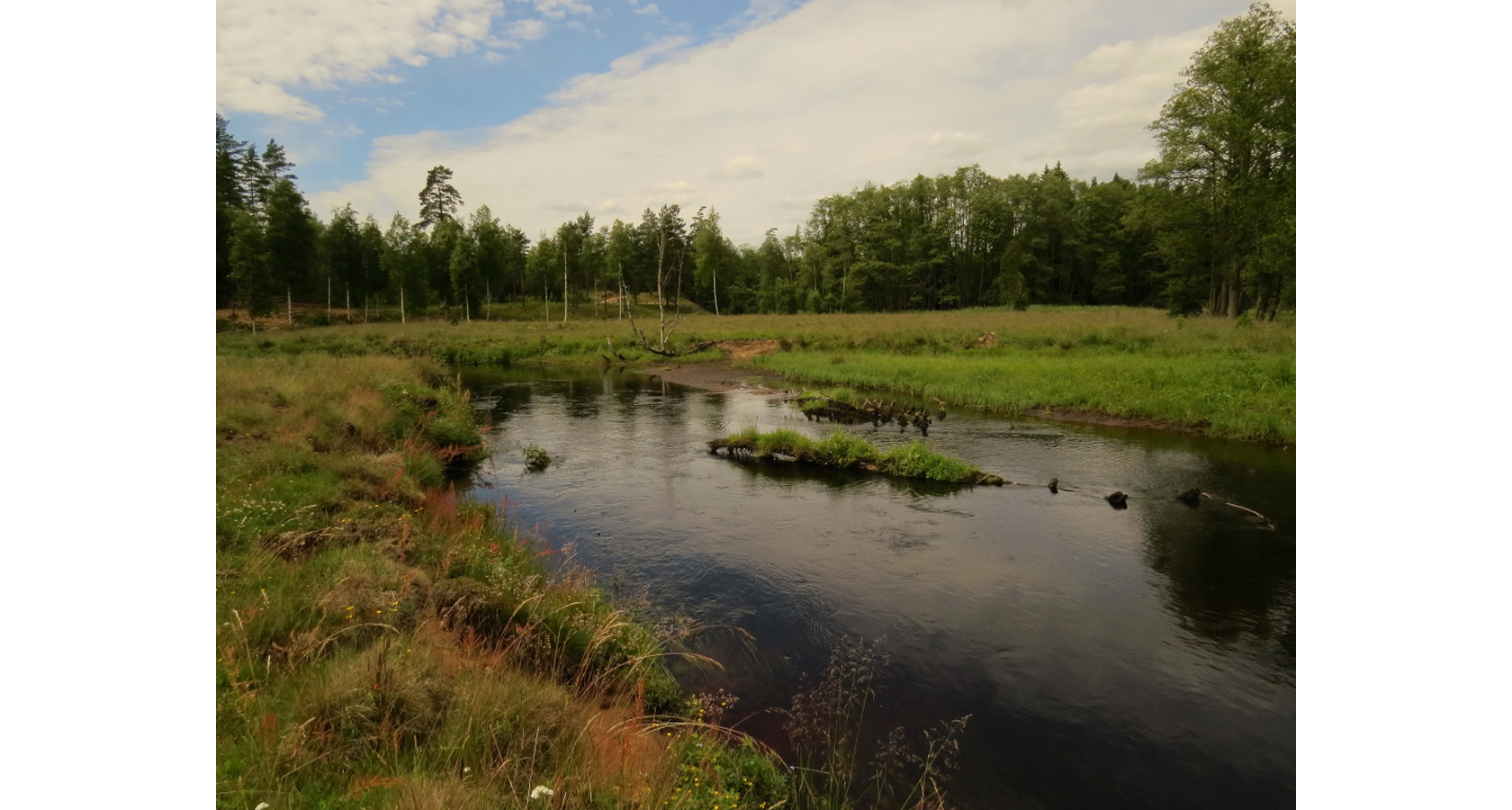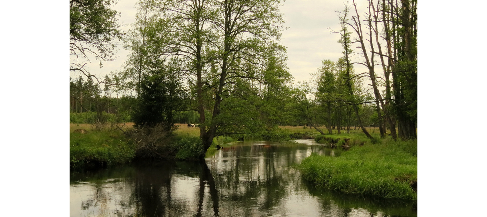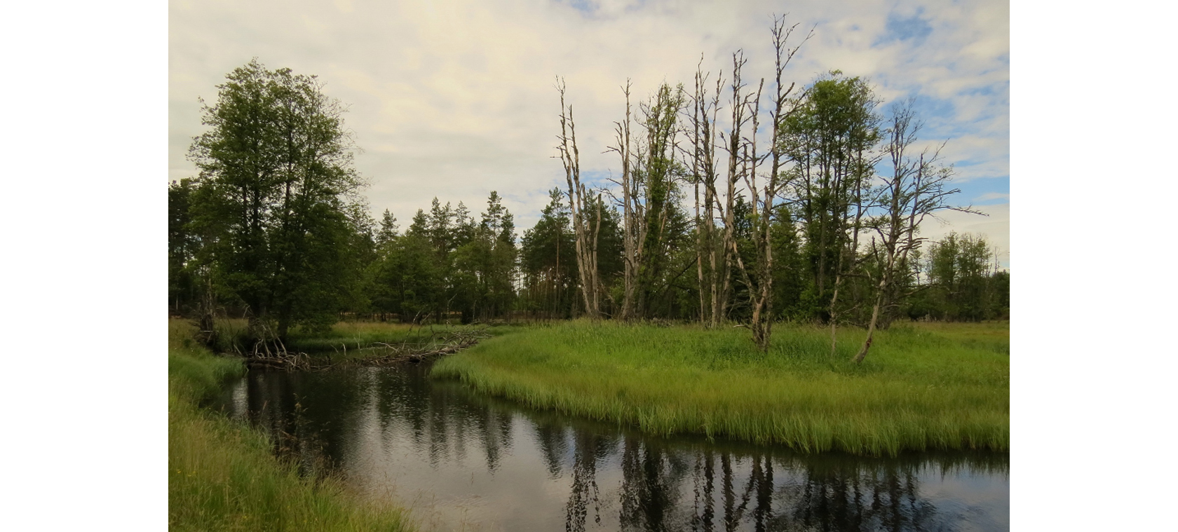 Det är något rofyllt vackert med detta landskap, det rinnande vattnet, de vackra strandängarna med tallmoarna i bakgrunden, bården med klibbal samt med de betande nötkreaturen.