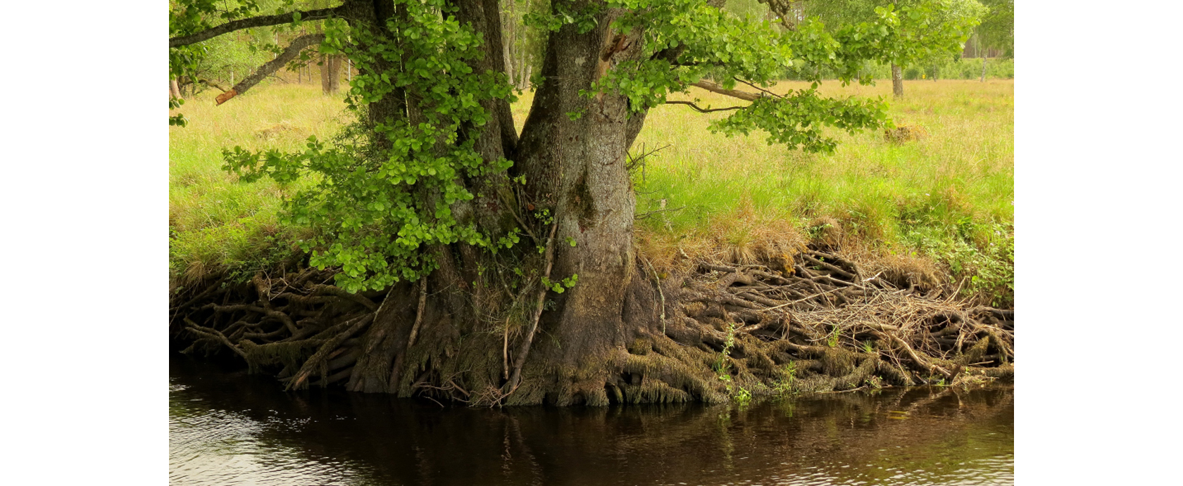 Ett enormt stort rotsystem är synligt vid denna välväxta klibbal, ”Alnus glutinosa”, alldeles invid Lagans långsamt flytande vatten.