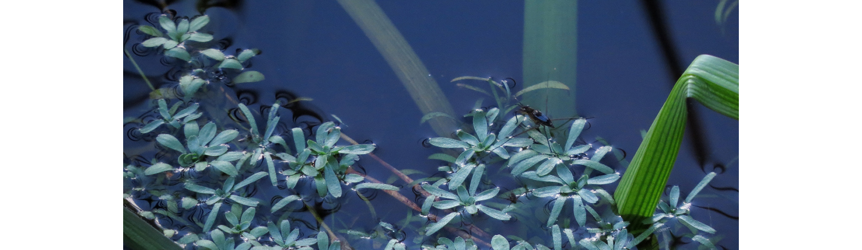 Bilden visar förmodligen arten sommarlånke, ”Callitriche cophocarpa”, och till höger på bilden sitter en ensam skräddare, ur ordningen ”Gerridae”, med alldeles blå vingar, en optisk illusion eller verklighet, svaret blir jag er tyvärr skyldigt.