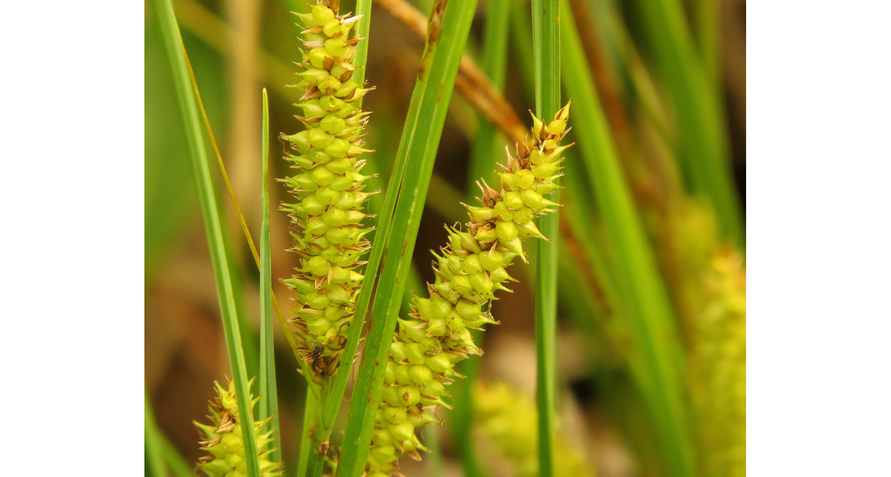 Bilden visar arten blåsstarr, ”Carex vesicaria”, som är en relativt storväxt starr ur släktet ”Carex”, som kan bli nästan en meter hög.