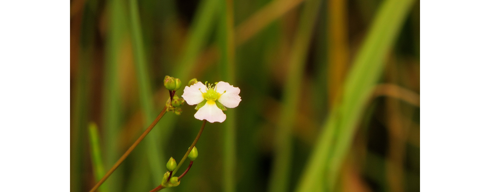 Bilden visar arten svalting, ”Alisma plantago-aquatica”, som är en vattenväxt med knappt meterhög stjälk som avslutas i en stor, gles, pyramidformad blomställning med talrika blommor.
