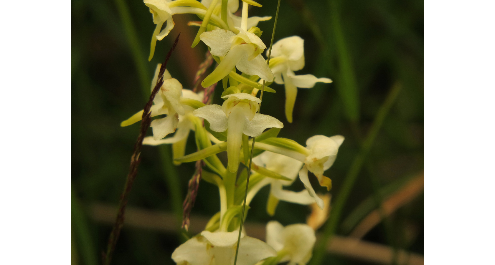 Bilden visar en grönvit nattviol, ”Platanthera chlorantha”, som är en växtart i familjen orkidéer.