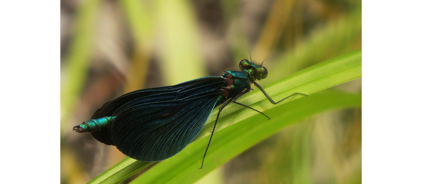 Bilden visar den vackra arten blå jungfruslända, ”Calopteryx virgo”, som är en art i insektsordningen trollsländor som tillhör familjen jungfrusländor.