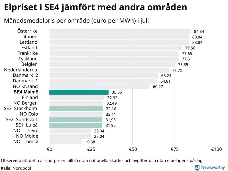 Om man tittar på månadsmedelpriset brukar de svenska elområdena oftast tillhöra de med lägst spotpriser i en europeisk jämförelse. Värt att notera är att detta handlar om spotpriser, de priser konsumenten sedan betalar beror på nationella avgifter och skatter samt elbolagens påslag. I praktiken ligger de svenska konsumentpriserna närmare det europeiska snittet efter skatter och påslag.