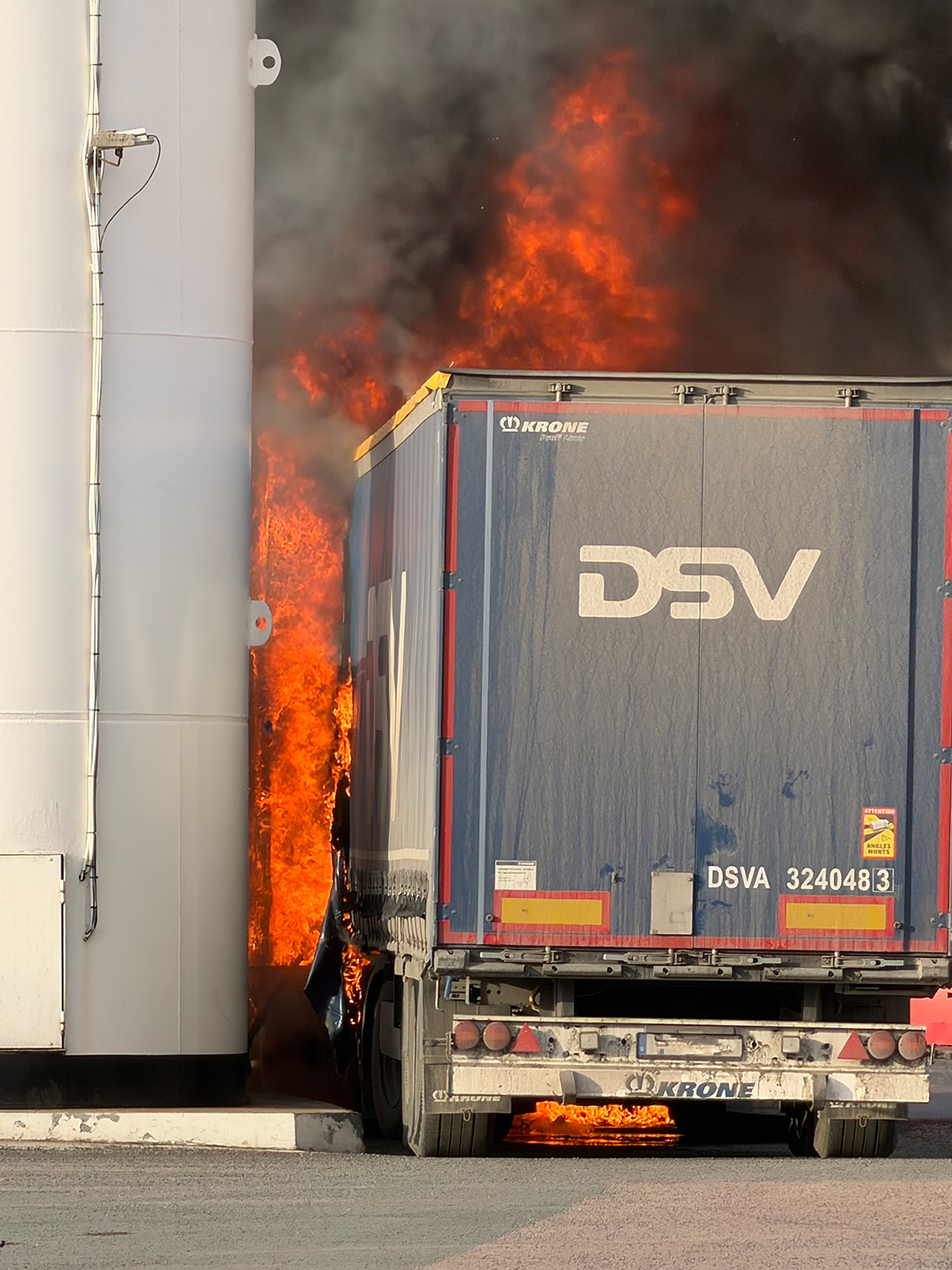 SOS ledningsoperatör uppger att branden nu är släckt samt att man lyckats med att begränsa den till det utsatta fordonet. Man arbetar nu med att undersöka om det uppstått några läckage. Ingen person behövde medfölja ambulans.