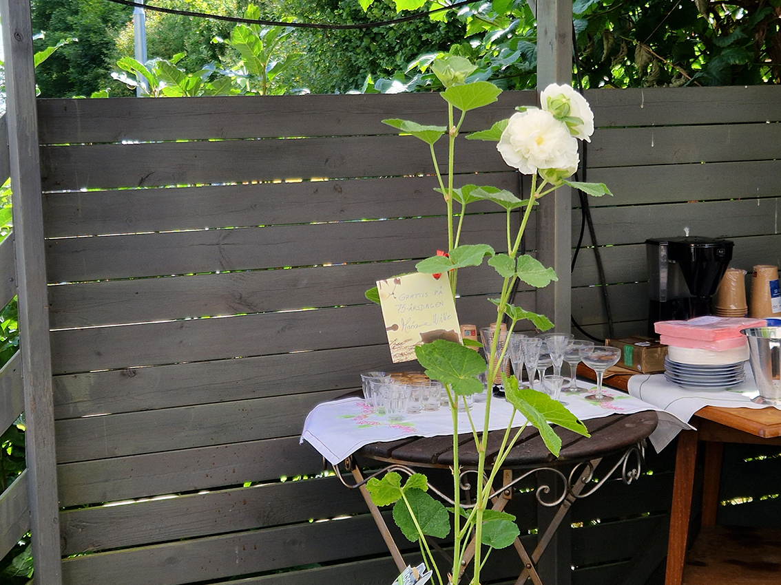 Fyra pannkakstårtor har gjorts och det bjöds både på kaffe och annat om man så önskade. Första trädgårdsfesten arrangerades för fem år sedan, dagen då Lars fyllde 70. I går fyllde Lars 75 och femte årgången av trädgårdsfest läggs därmed till handlingarna.