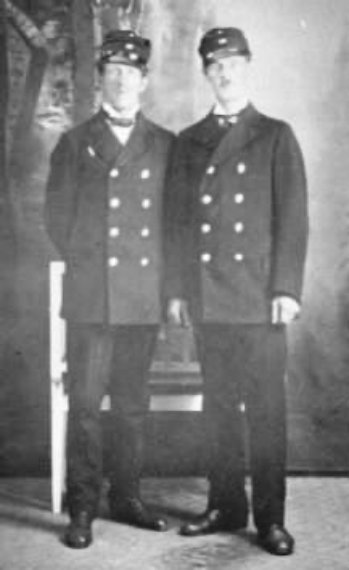 Svågrarna Herman Karlsson och Fredrik Palmqvist ses här i den första HNJ-uniformen (HNJ = Halmstad Nässjö Järnvägar). Knappar i kavaj, väst och mössa var i försilvrad mässing med motiv av ånglok. På mössan fanns deras anställningsnummer i silver.