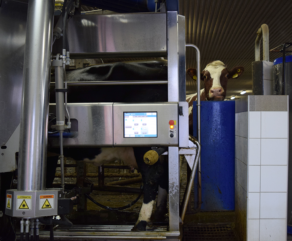 Det första Fredrik gör när han vaknar är att kontrollera att allt är som det ska i ladugården. Nu kan han faktiskt göra det under sitt morgonkaffe vid köksbordet. App i telefonen talar om vilken ko det är som inte varit inne i mjölkroboten på tidpunkter de ska, om det är någon mjölk som inte håller måttet. Det finns ett litet laboratorium i varje mjölkrobot som talar om det är något avvikande med mjölken. Om det skulle vara för hög cellhalt (bakterier) i mjölken kommer denna att tömmas i en annan tank än den som Arla kommer och hämtar.