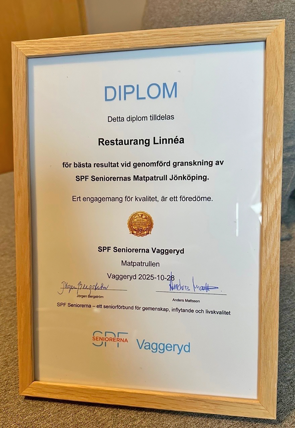 I samband med månadsmötet hos SPF Seniorerna Vaggeryd delades diplom ut till Restaurang Linnéa, som fått fem av fem stjärnor av matpatrullen.