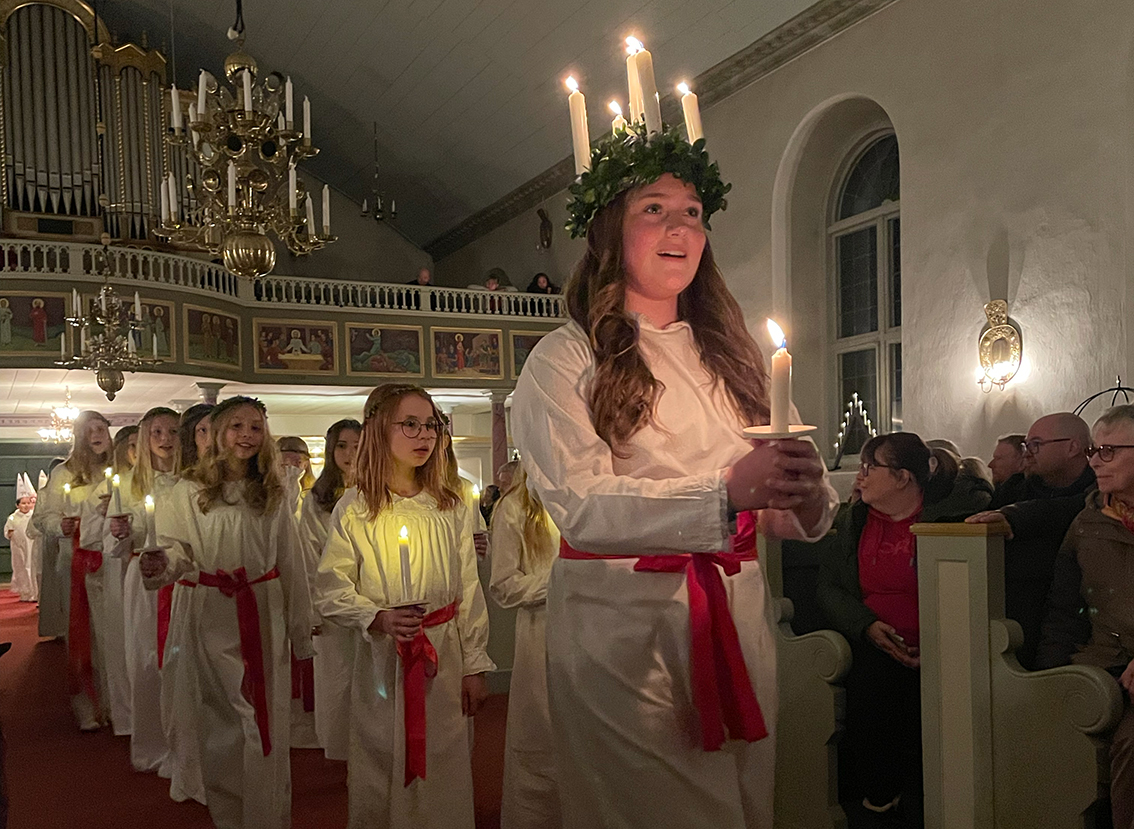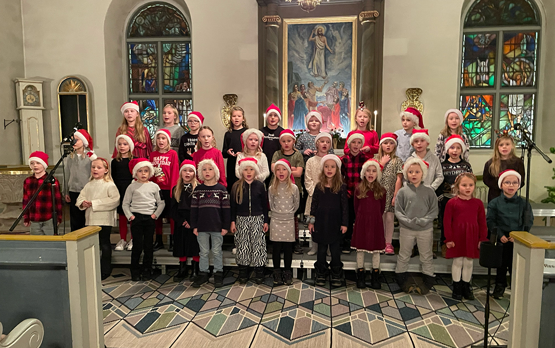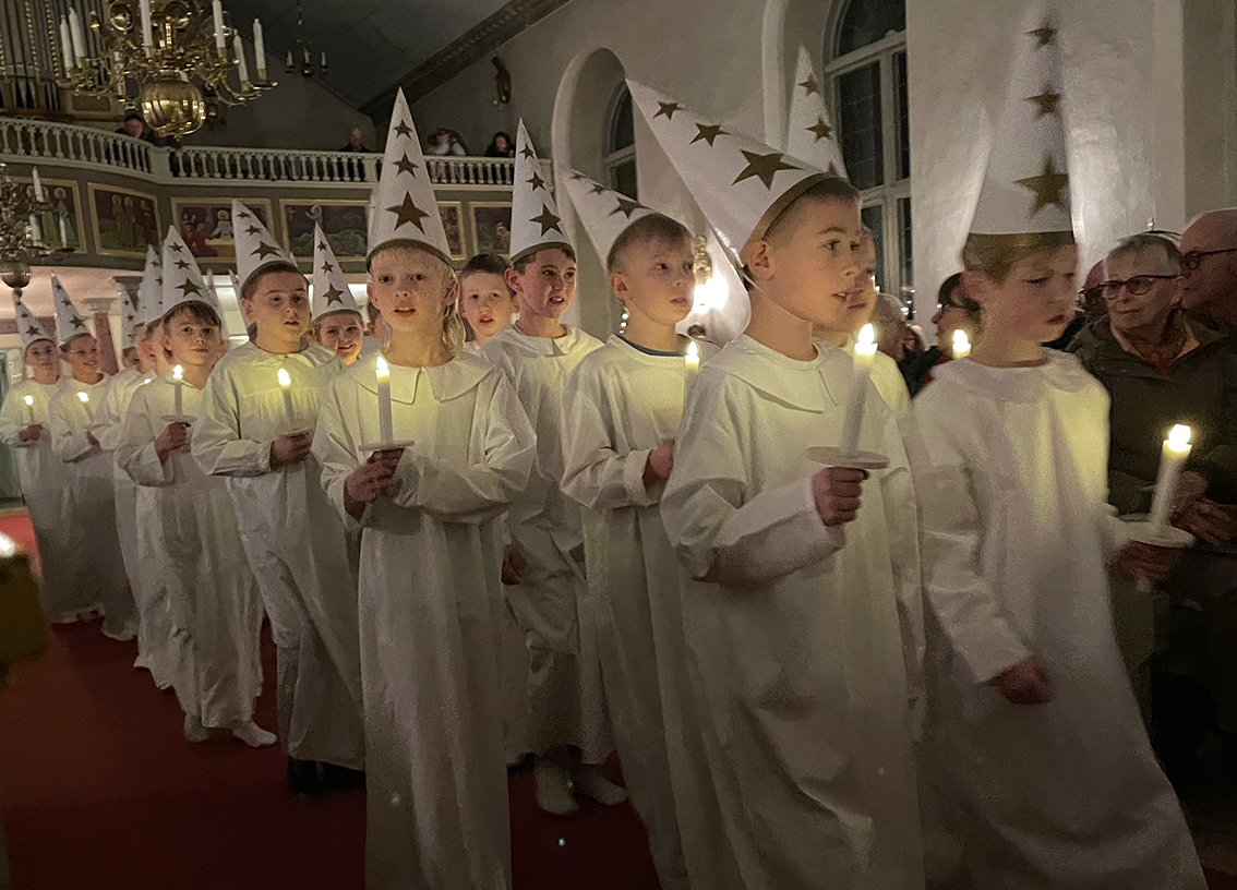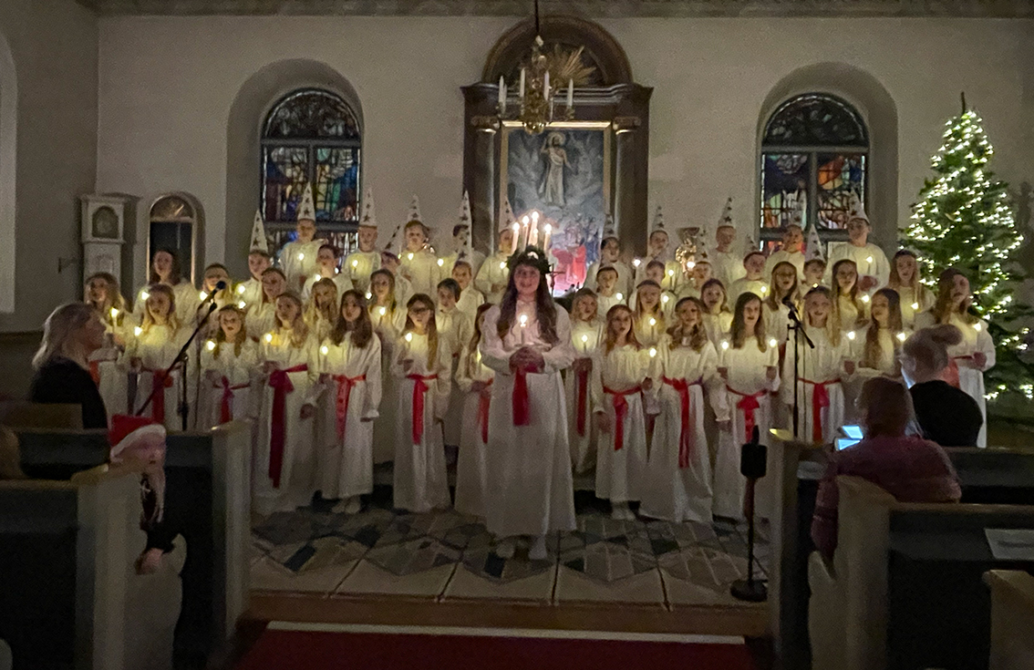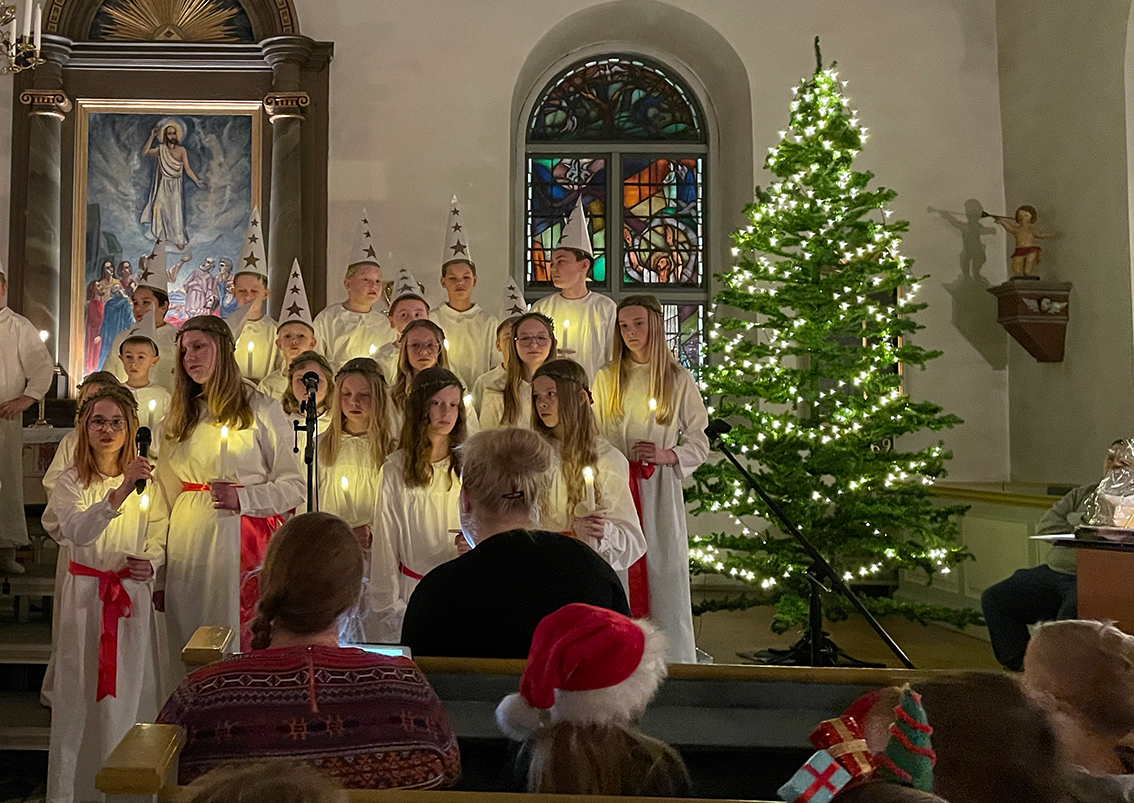 Först ut var förskoleklass upp till årskurs 2 som sjöng några fina julsånger. Sedan var det dags för lucia med tärnor och stjärngossar att skrida in i kyrkan och sjunga. I luciatåget sjöng elever från klass 3 till 6.
