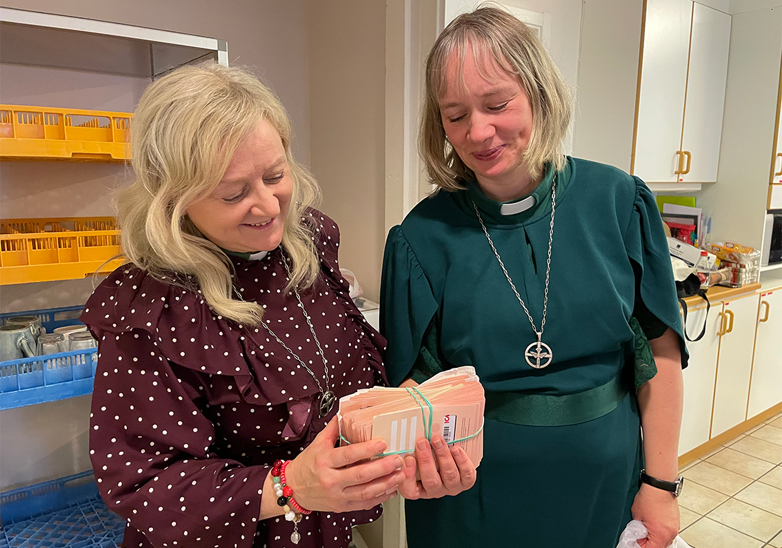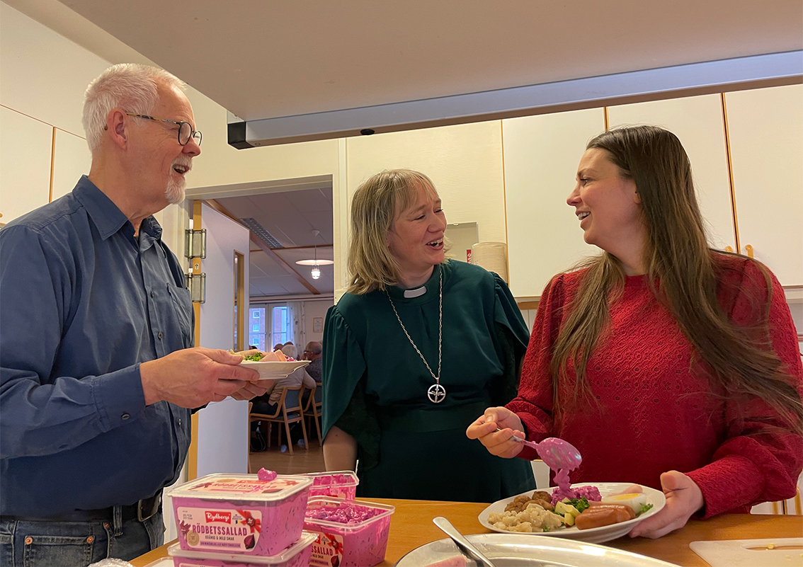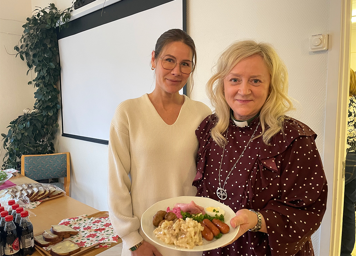 – Tack vare insamlingen Julklappen har vi också fått pengar så att vi kan dela ut presentkort för mat till alla hushåll. Det är vi fantastiskt tacksamma och glada för. Vi märker att det här betyder jättemycket för många. Och att få bli bjuden på en fest och få sitta ner och bli serverad vid bordet. Det här är en uppskattad tradition, säger diakon Karoline Lundén.