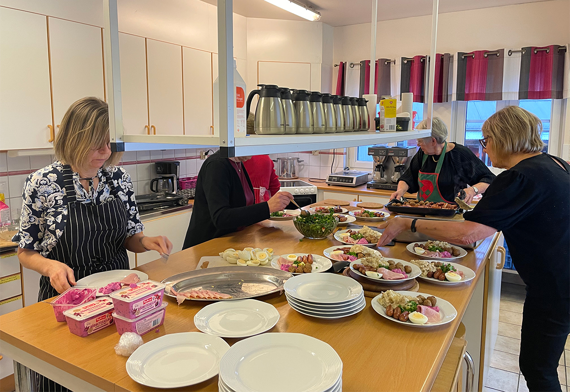 I Equmeniakyrkans kök är det full rulle. Massor av tallrikar står uppställda på bänkar i köket. Det fejas och ordnas, läggs upp Janssons frestelse, prinskorvar, grönkålssallad och annan julmat på tallrikarna. Och det ordnas med efterrättstallrikar. Majlen Sjöholm är en av alla volontärer som hjälper till i dag. Hon lägger på lingongrädde och en klick med lingonsylt på efterrättspepparkakan.