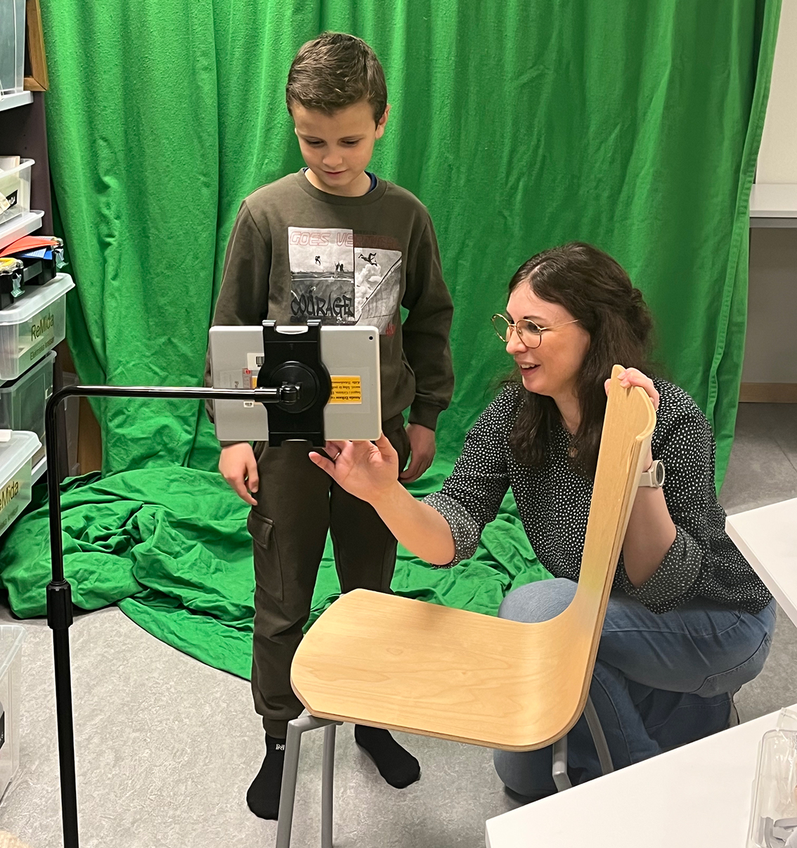 Elias fick prova green screen. Här tillsammans med Mia Olausson.