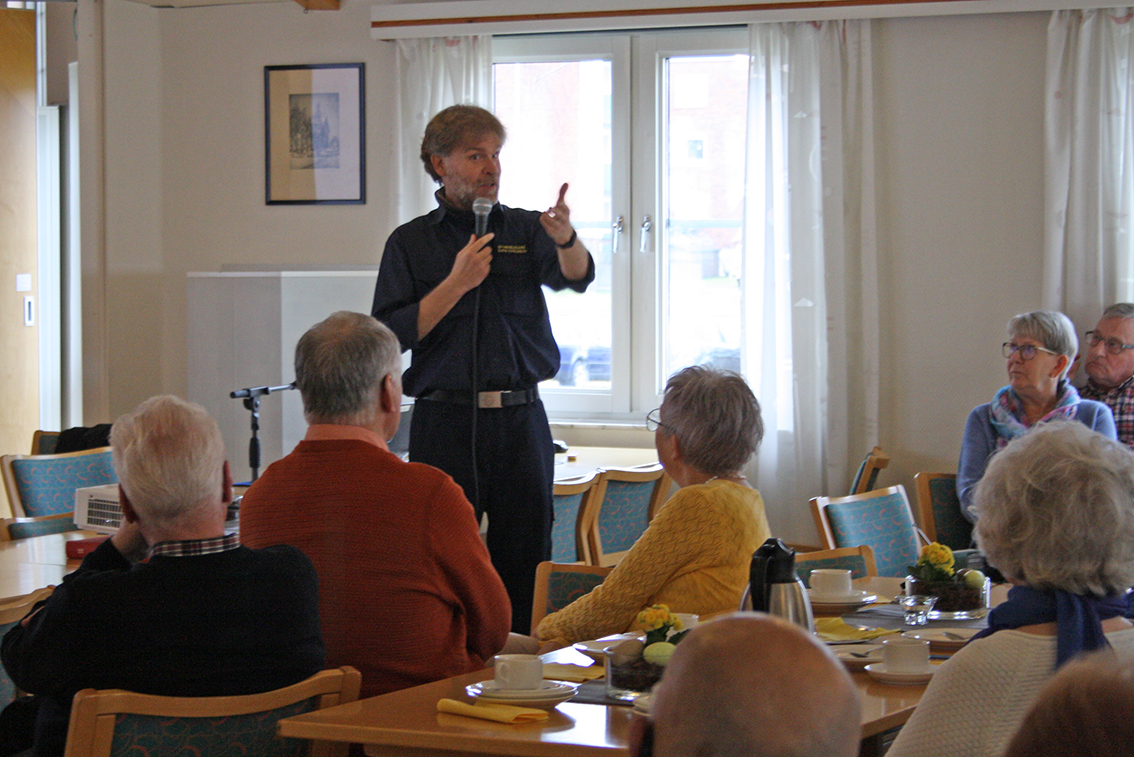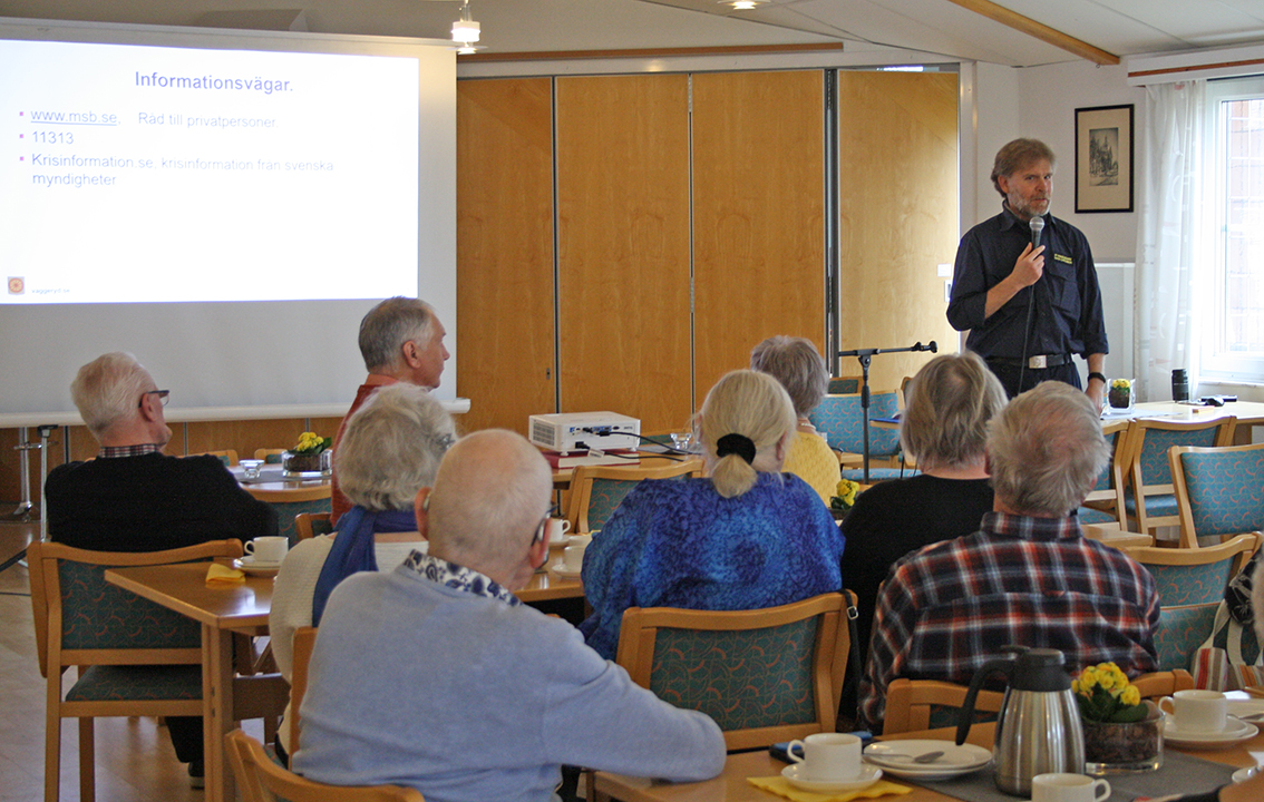 Mats Carlsson från räddningstjänsten pratade säkerhet. Hans tema var: ”Bättre tänka efter före - så får du koll innan krisen”. Han gav tips om hur man ska förbereda sig om det skulle bli en kris i samhället. Skulle det bli strömavbrott eller någon annan typ av kris ska man klara sig minst en vecka med vatten, mat och värme.