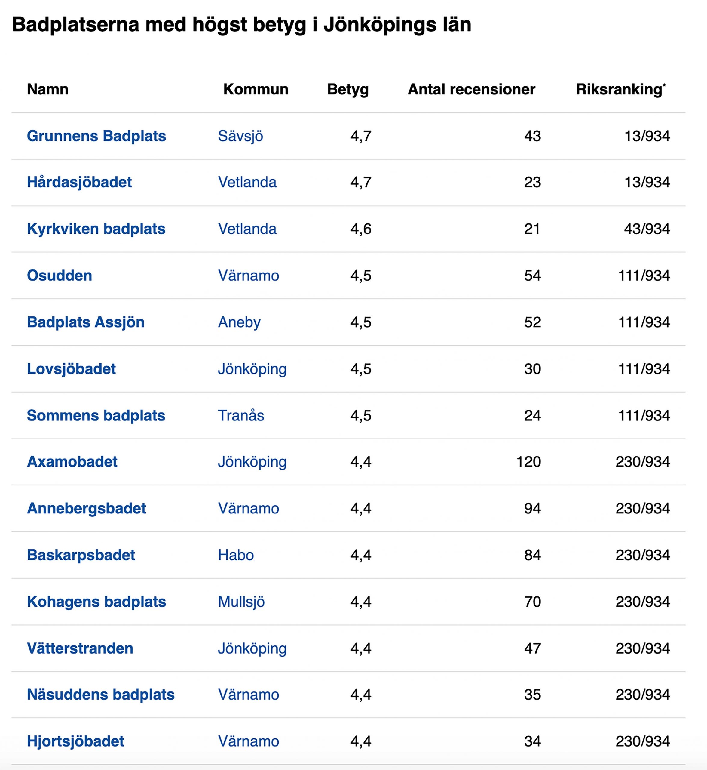 Linneryds badplats, Hjortsjöbadet, Långasjöbadet, Rasjöbadet och Rolstorpabadet har färre än 20 recensioner och ingår därför inte i den här jämförelsen.
