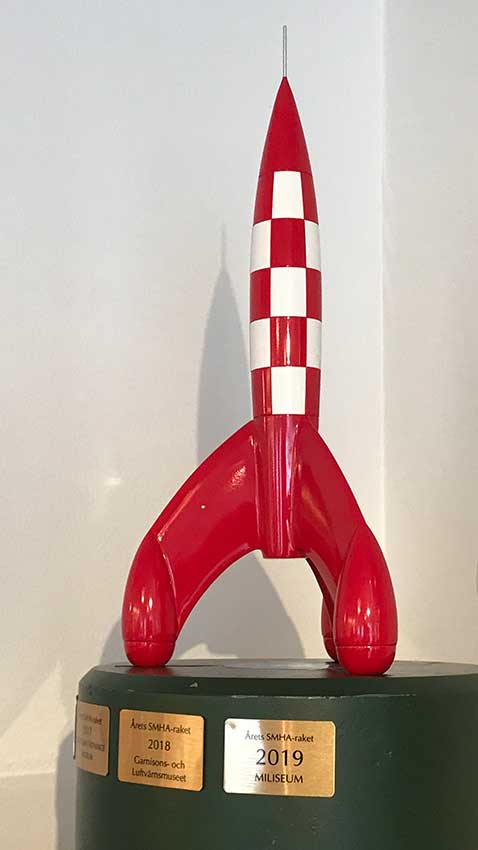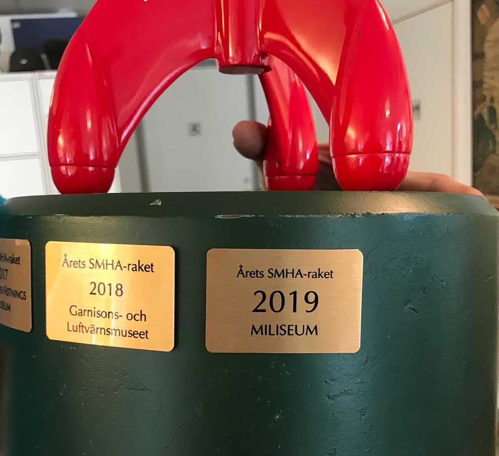 Museichefen Sven Engkvist fick i torsdag ta emot utmärkelsen som består av – just det, en raket i modell. Detta är ett vandringspris inom SMHA, museerna i Sveriges Militärhistoriska Arv.