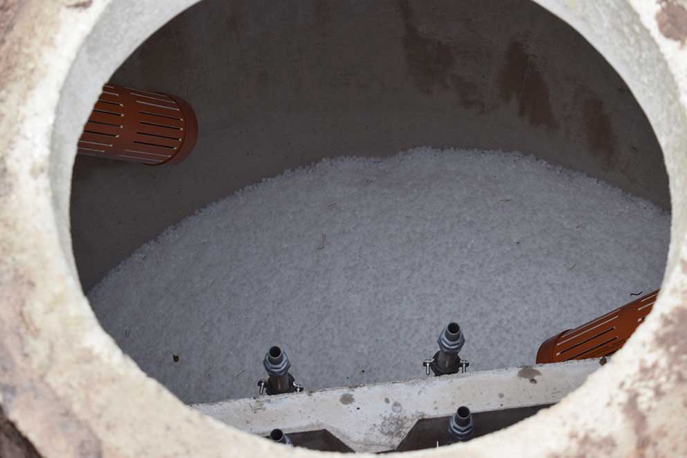 – Här är en uppsamlingsbrunn som även kallas dämpningsbrunn. Här rinner avloppet ner först i och ska egentligen ”ligga till sig”. Den här brunnen töms en gång om året. Vid nästa brunn syresätts det och många många små plastdetaljer (reds anm; hundratusentals) ligger i brunnen som ska filtrera avloppsvattnet. Plastdetaljerna kallas biohudbärare på VVS-språk och gör att det blir biologisk rening. Vid nästa brunn pumpas allt tillbaka till brunn nummer ett igen och så vidare. Till slut är det enbart vatten kvar när det rinner ut i sista brunnen. Från den brunnen har nu avloppet blivit rent vatten och rinner ut i en klargörningsbädd som, för vår del, är 20 kubikmeter makadam innan det rinner ut i diket här bredvid. Avloppsvattnet är nu färdigrenat och det är en smidig och smart lösning att det har hand om allt själv, berättar Lars-Göran.