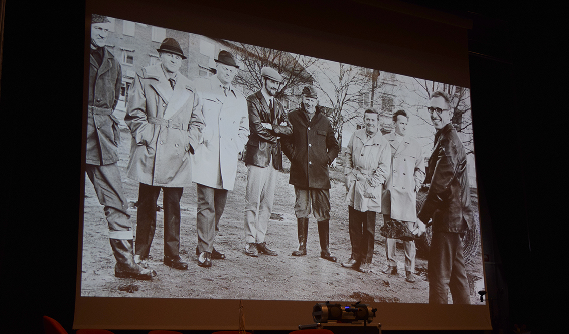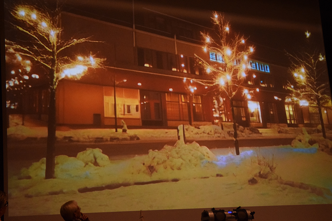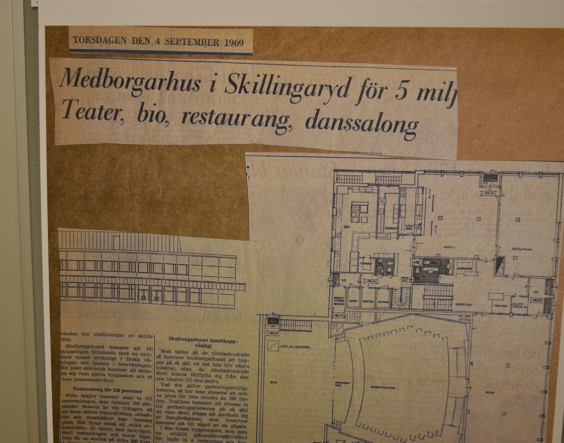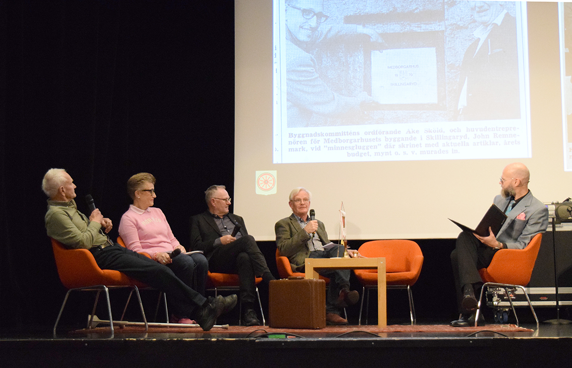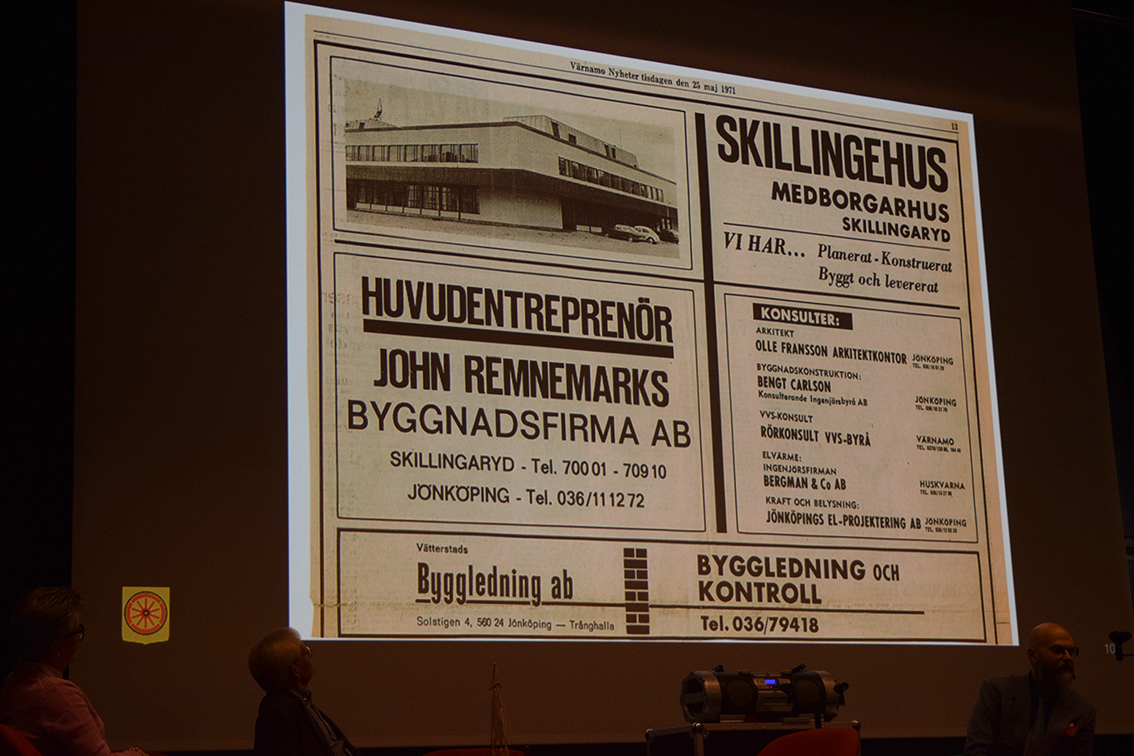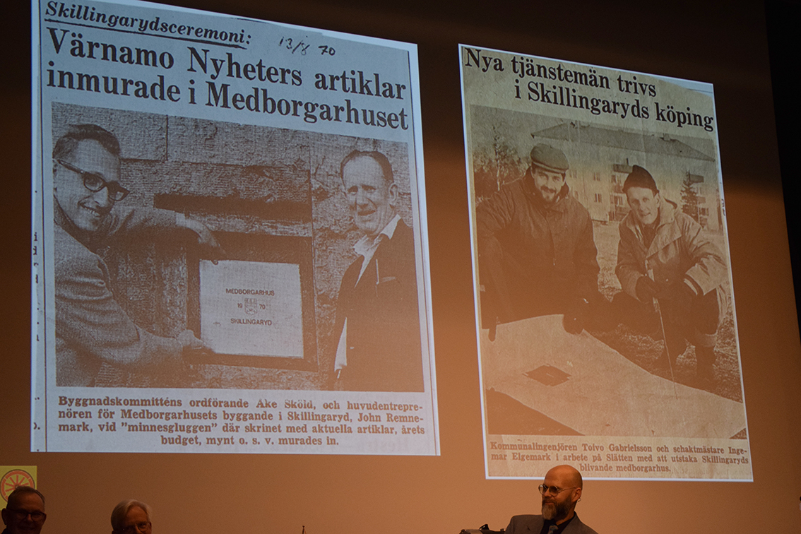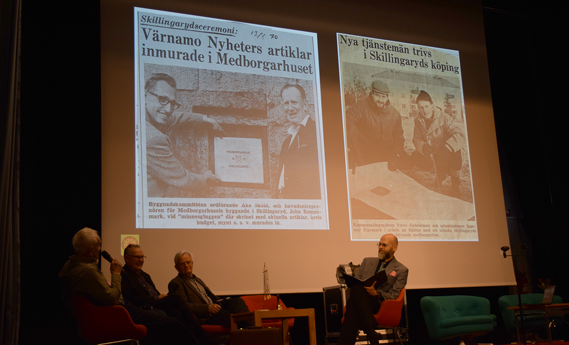 På scenen skulle det under kvällen bjudas upp profiler och bjudas på revystämning. Ett bildspel visades upp från byggarbetsplatsen i slutet av 60-talet. Ingemar Elgemark, Kenneth Åberg, Carina Remnemark och Gert Jonsson tog plats på scenen. På bild visas kommuningenjör Toivo Gabrielsson och schaktmästare Ingemar Elgemark. Ingemar berättar om bilden: – Just den bilden var anledningen till att jag kom hit i kväll. Bilden väcker minnen. Toivo och jag anställdes i Skillingaryds köping 1968. Knappt ett år är bilden tagen där vi sitter på huk vid medborgarhuset. Innan fanns det här på platsen ett samfällt, en sandslätt. Skillingaryds marknad arrangerades här tidigare. Vi hade en aning om vad det skulle bli, vi var unga tjänstemän och fick uppdrag att placera huset där planritningen visade mellan järnvägsområdet och Bangårdsgatan. Front mot norr in mot Skillingaryds torg. Jag sitter med en tumstock i handen, det var enkla medel på den tiden och måttband och måttstock användes. Skillingaryd hade ingen samlingslokal för offentligheten.