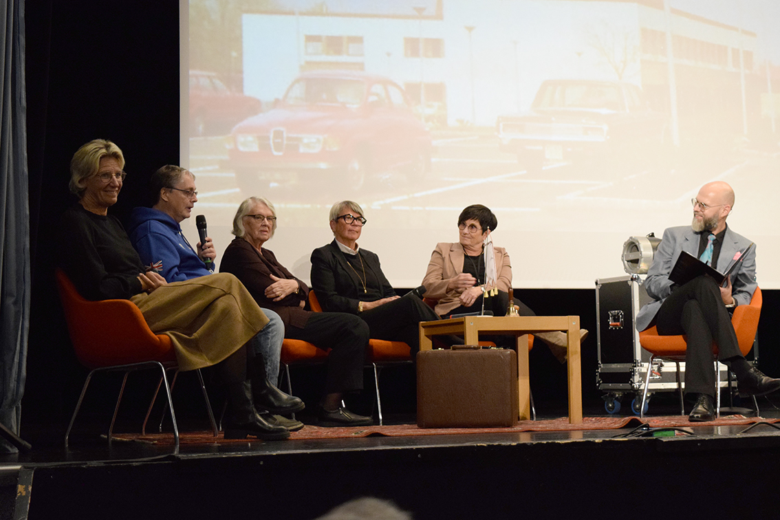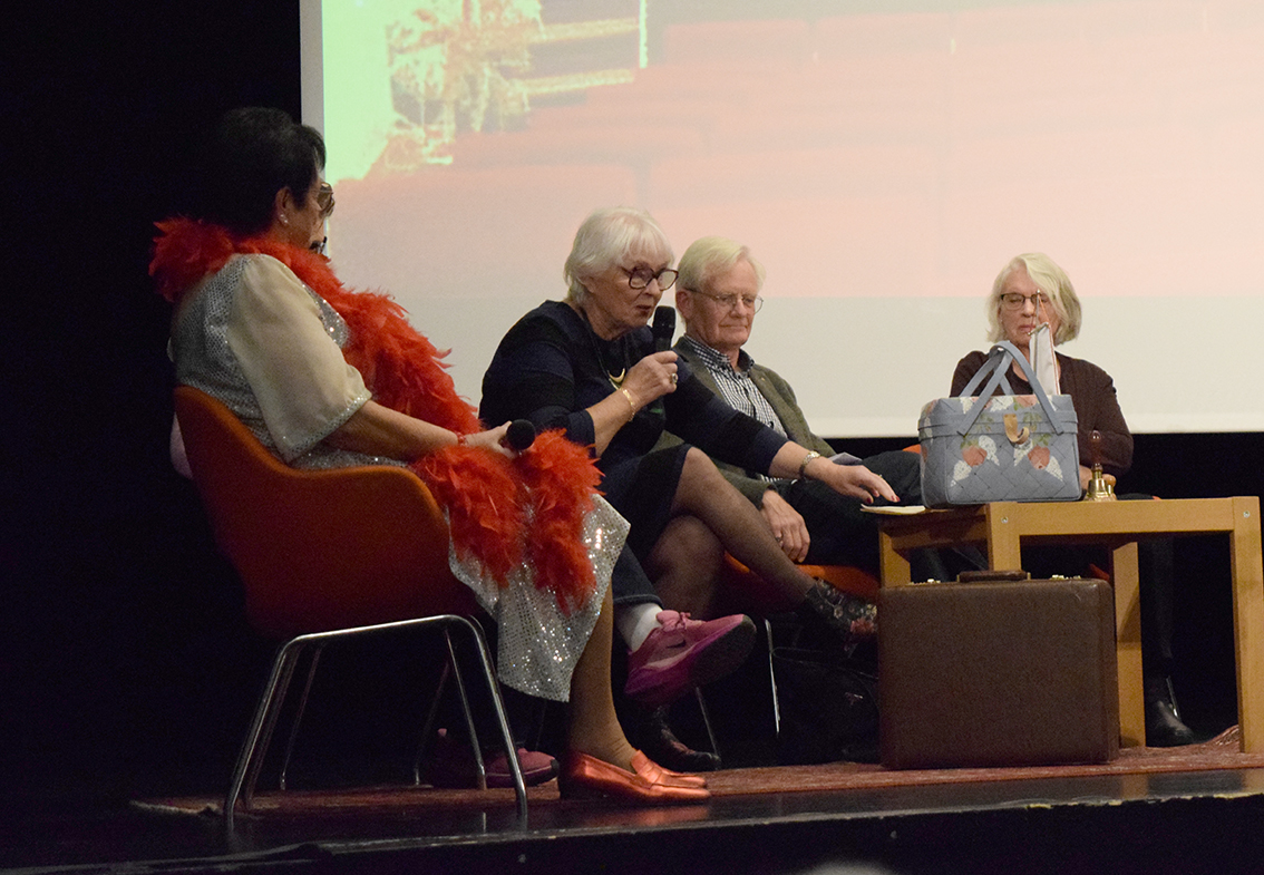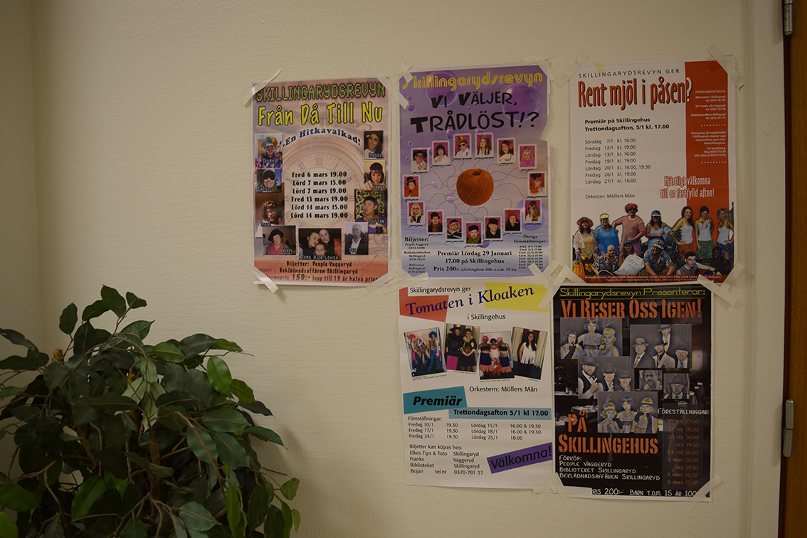 Hur var Skillingehus som arbetsplats?  Ingeborg Palm, Eva Carlsson, Annika Hedvall, Marita Sjöberg Wågesson och Torbjörn Lindberg kom upp på scenen. Eva var 17 år när hon började jobba på kommunkansliet. – Jag fick åka med de högsta männen till jobbet, Verner Göthberg och Lars-Gunnar Brännström plockade upp mig vid Götafors skola varje morgon. På den tiden hade man inga datorer, vi använde oss av handskrivmaskiner, den som man skrev för stod bakom ryggen. Jag fick mitt jobb sedan på socialkontoret i Vaggeryd men vi flyttade tillbaka hit 2002 i det som då varit bibliotek tidigare.